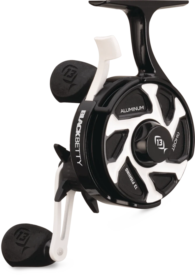 The 13 Fishing FreeFall Ghost Aluminum Reel features the groundbreaking FreeFall trigger enabling ice anglers to reach specific depths and achieve immediate hookups by releasing the trigger within desired zone. The precision-engineered aluminum spool facilitates quicker dropping of lighter lures. This reel boasts a new ultra-smooth competition drag system. With features like no line twist, drop-speed control, and a tangle-free spool cap, it offers a user-friendly design that streamlines line management and enhances the overall ice fishing experience.