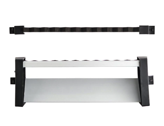The Abu Garcia® vertical 11-rod rack saves space while neatly and securely storing up to 11 rods or 6 complete rod and reel combos. Ideal for the shop, garage or boat dock.Use enclosed screws to attach to wood, metal, fiberglass or plastic. Use suitable wall anchor when applying to sheetrock or wallboard. Spacing between mounts vary depending on gear stored - recommended spacing between mounts is approximately 42".