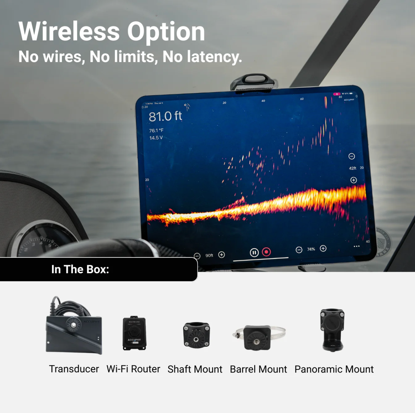PingLive Sonar is an innovative wireless Live Sonar system that uses your Phone or Tablet as the display via Wi-Fi connection. The transducer unit features an integrated processor, eliminating the need for a separate black box and reducing number of wires by 50% compared to traditional LiveSonar systems. With the included Wi-Fi Router, the transducer transmits sonar data to your screen, delivering sharp, real-time underwater visuals with minimal setup.