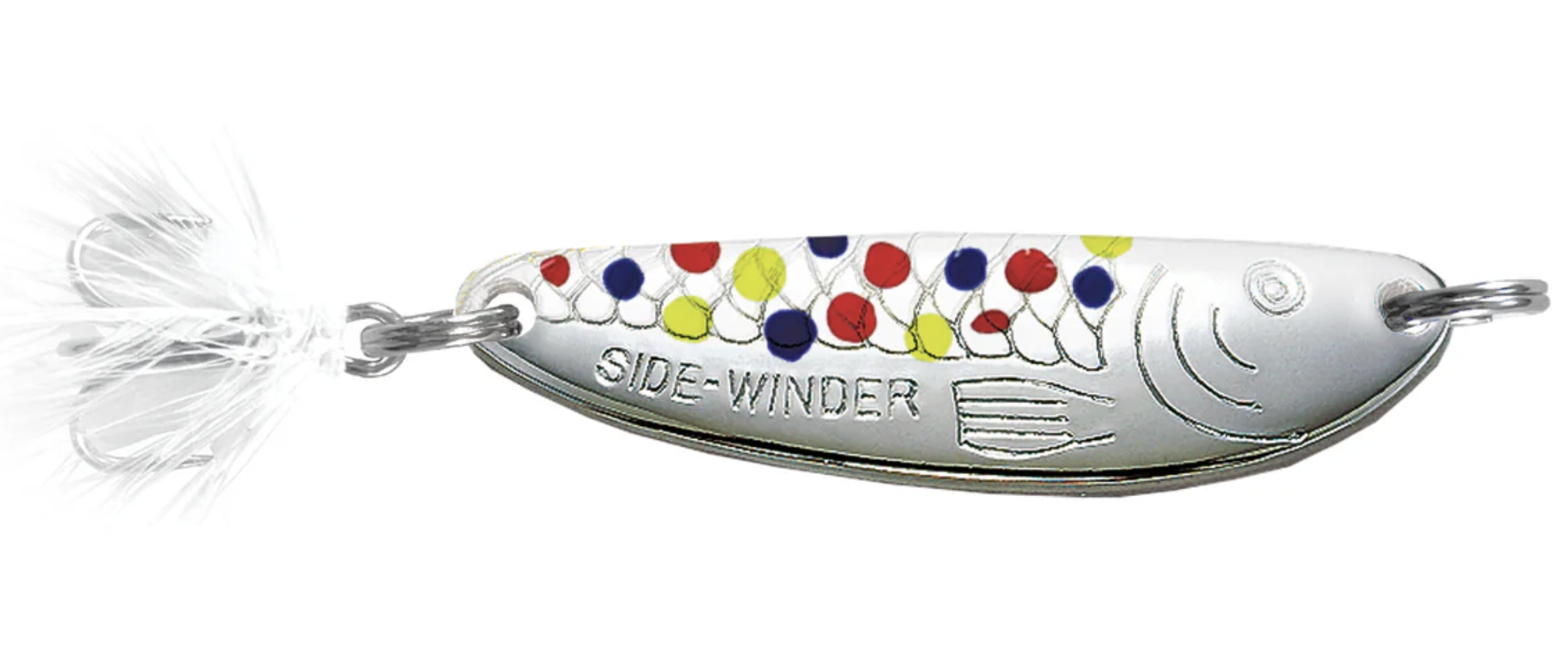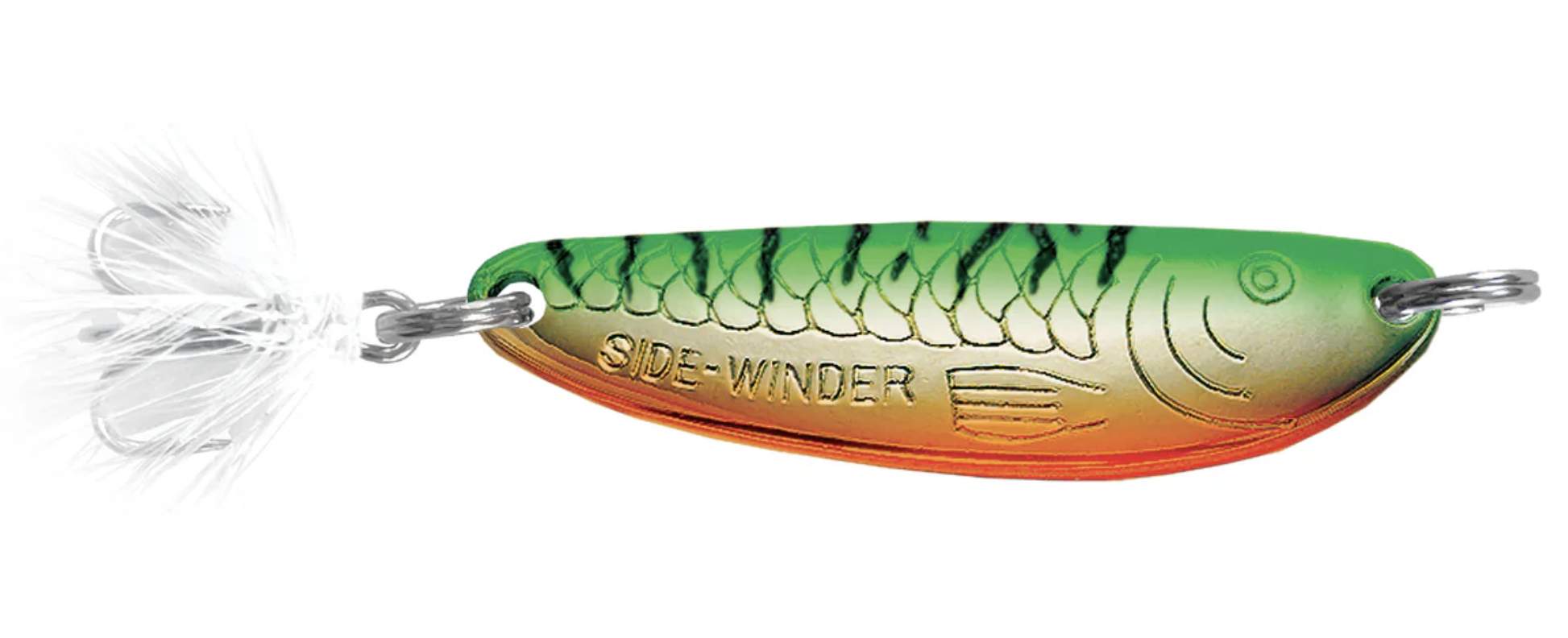 The new Acme Ice-Winder flutter spoon can be jigged with quick short lifts of the rod, creating an upwards darting action followed by a fall with a fluttering action to imitate an injured or scared baitfish. Slower jigging strokes allow the spoon a unique rocking motion that triggers stubborn fish. • 1/4 oz (#8 hook)• Treble hook tied with a feather• 1 spoon per pack