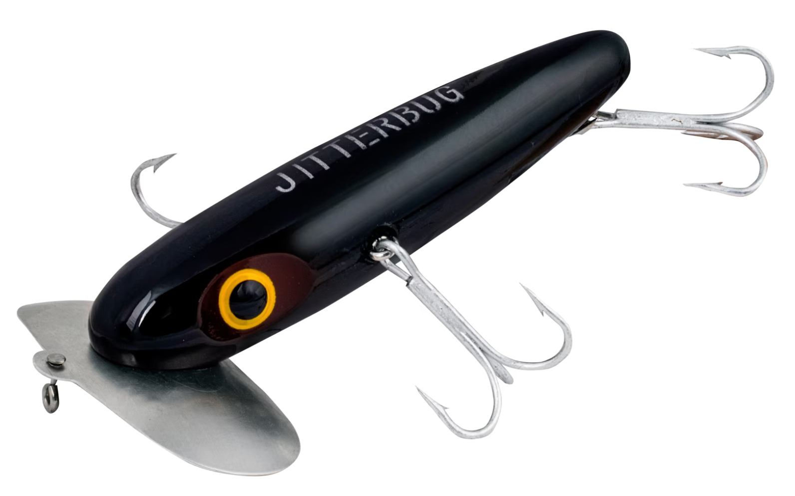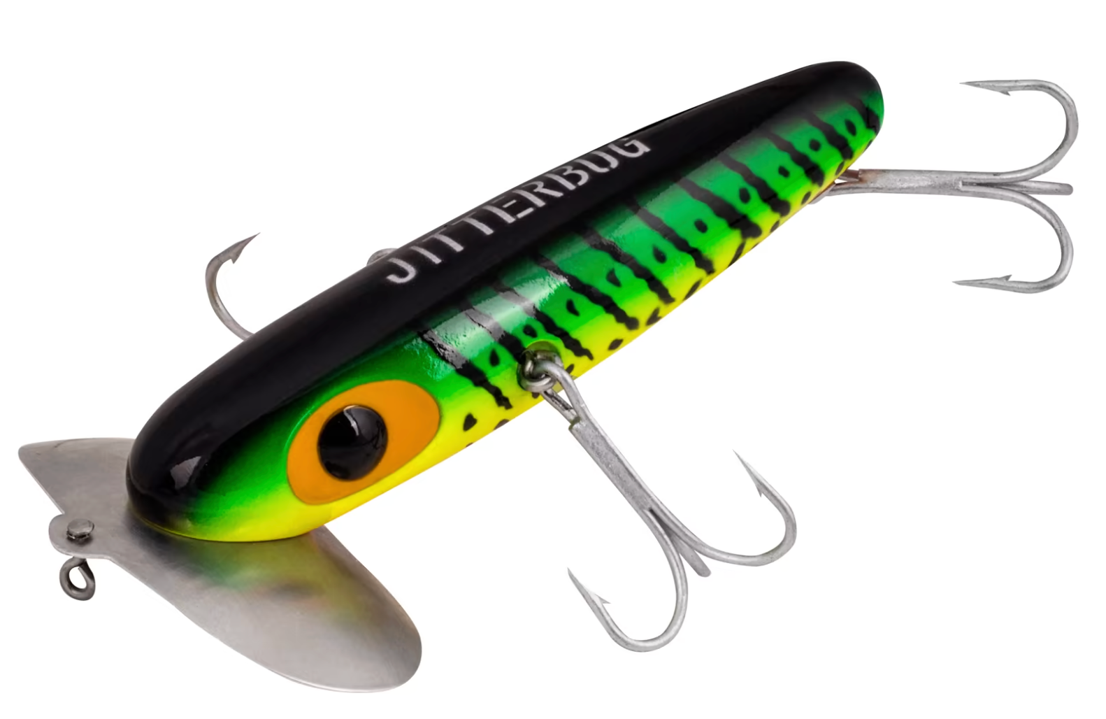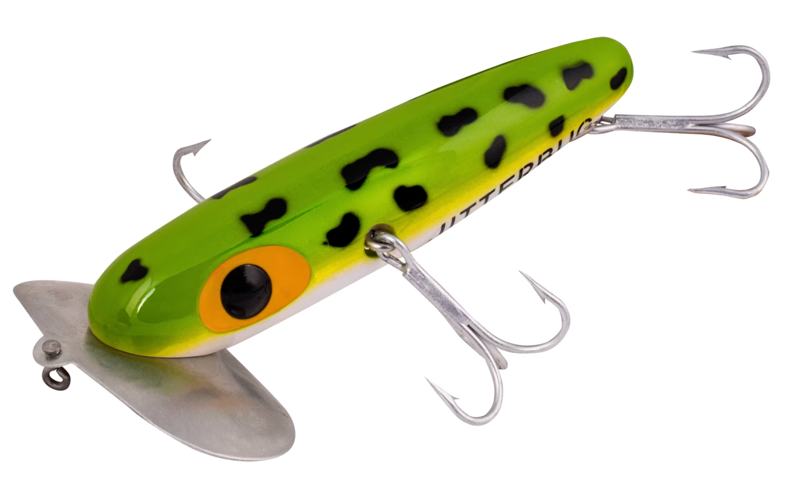 The famous back-and-forth, wobbling surface action of the wide-lipped Arbogast® XL Jitterbug has made it a mainstay in any muskie or pike fisherman's tacklebox. The offset front hooks of the "Muskie Jitterbug" ensure solid fish-holding power, and the lure's action keeps them from tangling with your line or each other. The steel double-lobed lip scoops the water and produces a unique plopping sound that aggressive fish just can't ignore.