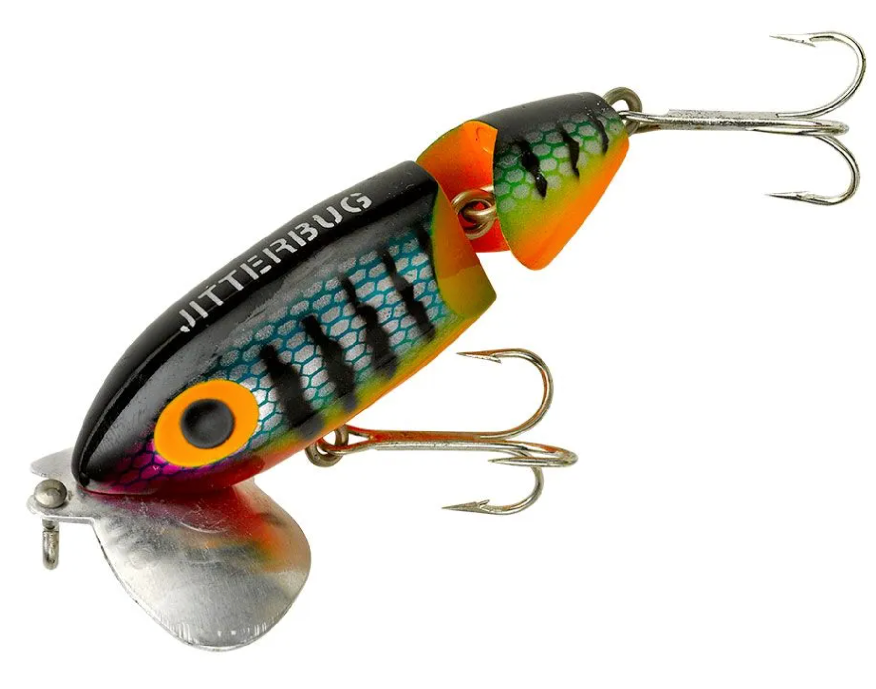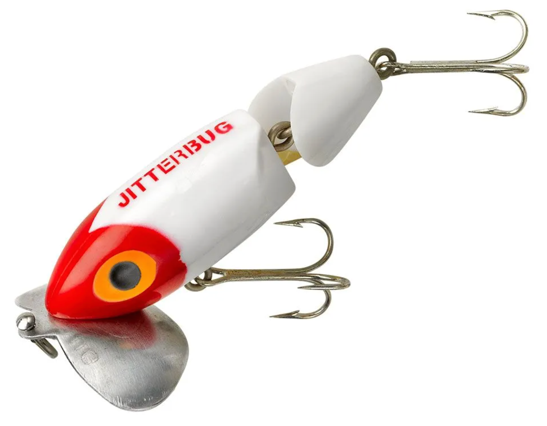 Take the surface-busting sound created by the Jitterbug's special lip add the action of these tail wagging Jointed Jitterbugs and anglers have the most action packed topwater lure available today. The motion of the jointed tail creates extra flash from the frantic swinging of the lure's bright plated treble hooks. They can be fished slowly to product the rhythmic plopping sound or faster to create surface commotion.