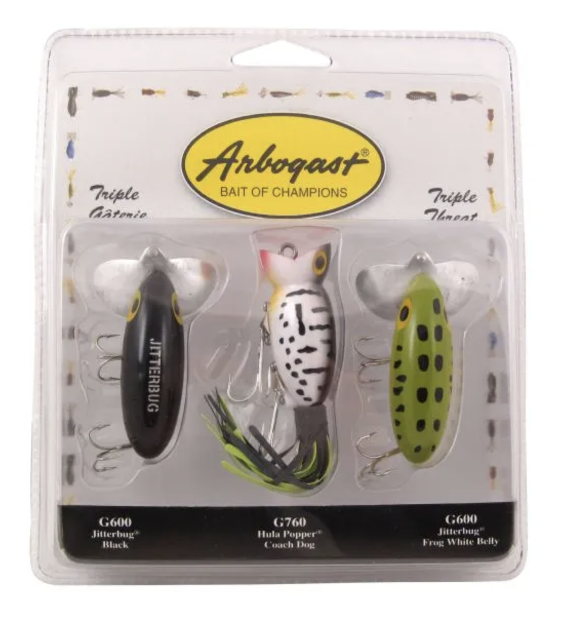 Three legendary Arbogast topwaters in one package. With two Jitterbugs and a Hula Popper, all in the most-productive color patterns, you're ready to take on big bass, pike or other gamefish day or night..