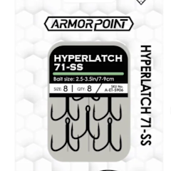 Featuring a weight-to-power ratio designed specifically for jerkbait fishing, the BKK Armor Point Hyperlatch 71-SS Treble Hook utilizes a light-wire construction to keep jerkbaits perfectly balanced in the water column. Forged with BKK's Hyper Carbon Steel for a 25% stronger and 30% harder wire, the Armor Point Hyperlatch 71-SS Treble Hook is designed to outperform the rest of the traditional high-carbon steel hooks.