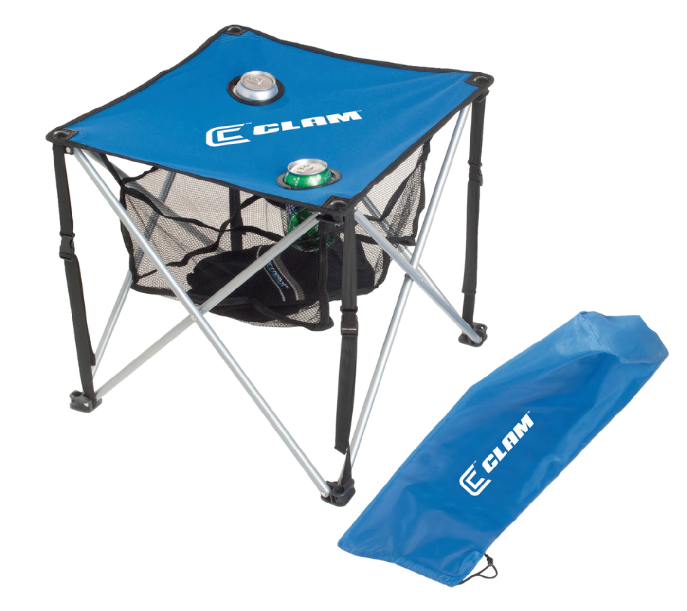 The Quick-Pack Square table is an ultra-light folding table featuring two cup holders deep enough to hold a bottle or tall coffee cup without tipping. This table also includes an under table mesh storage basket and a carry bag for transporting. Great for ice fishing, camping, or a day at the beach.