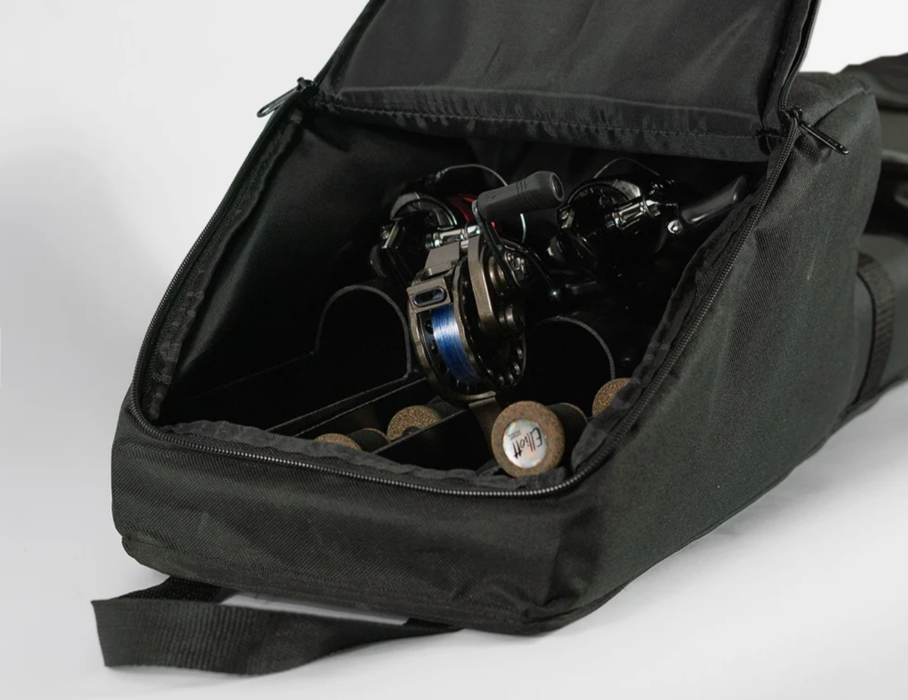 • Stores four ice rods up to 48” in length• Each rod protected in full length PVC tube• Top zippered section is padded to protect reels• Durable nylon, water resistant fabric• Two zippered pockets with mesh front• Adjustable shoulder strap• Ratchet strap loops for securing to ATVs, snowmobiles, etc• Reinforced side carrying handle