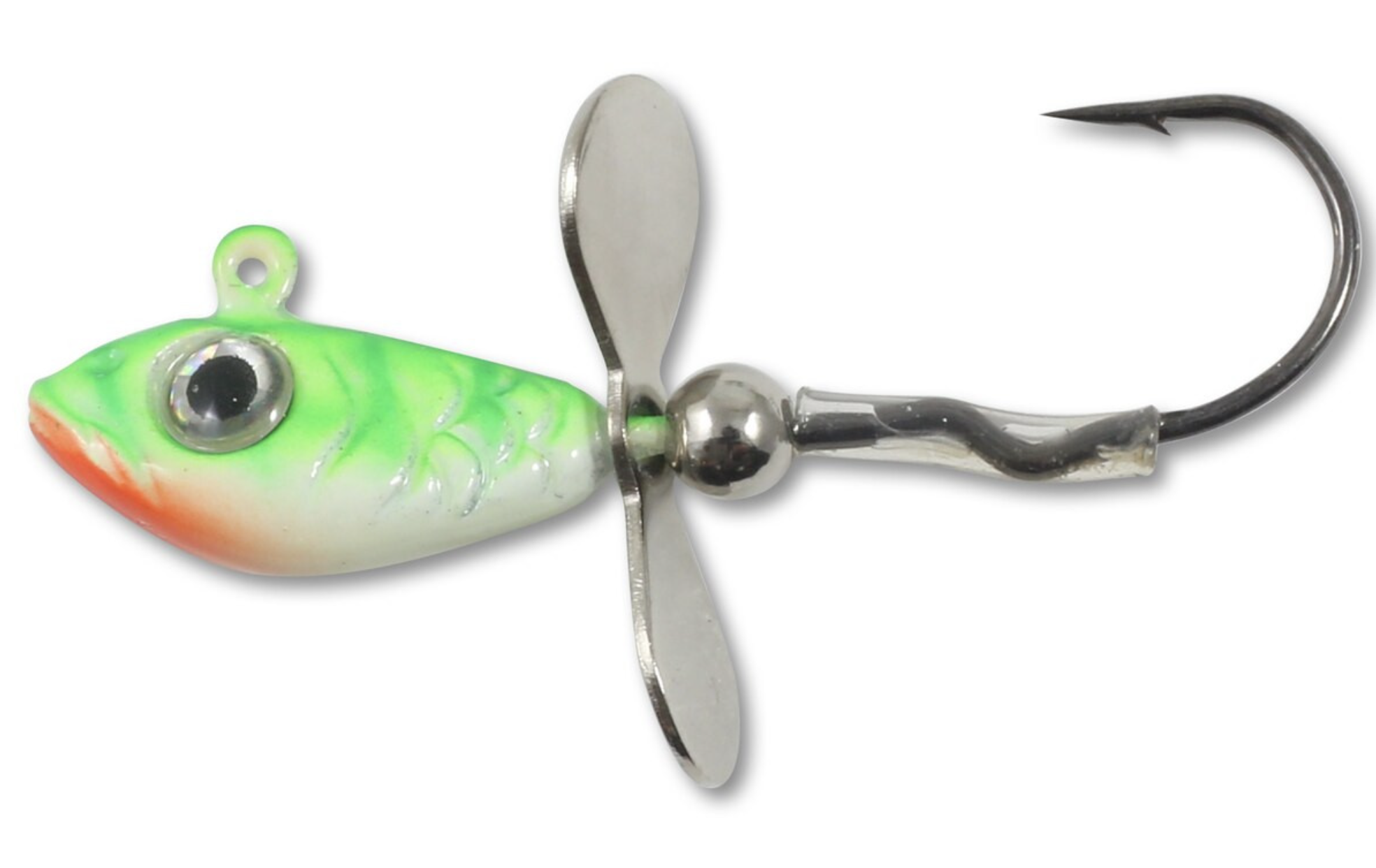 Great for walleyes, bass, pike, trout and jumbo panfish. Offers the same fish-attracting metallic propeller as the original Whistler® Jig, plus a sleek head design and optically brightened, high-vis UV colors that excel in low-light conditions and stained or muddy water. Cast or jig. Tip with live bait or soft plastics like the IMPULSE® Smelt Minnow.