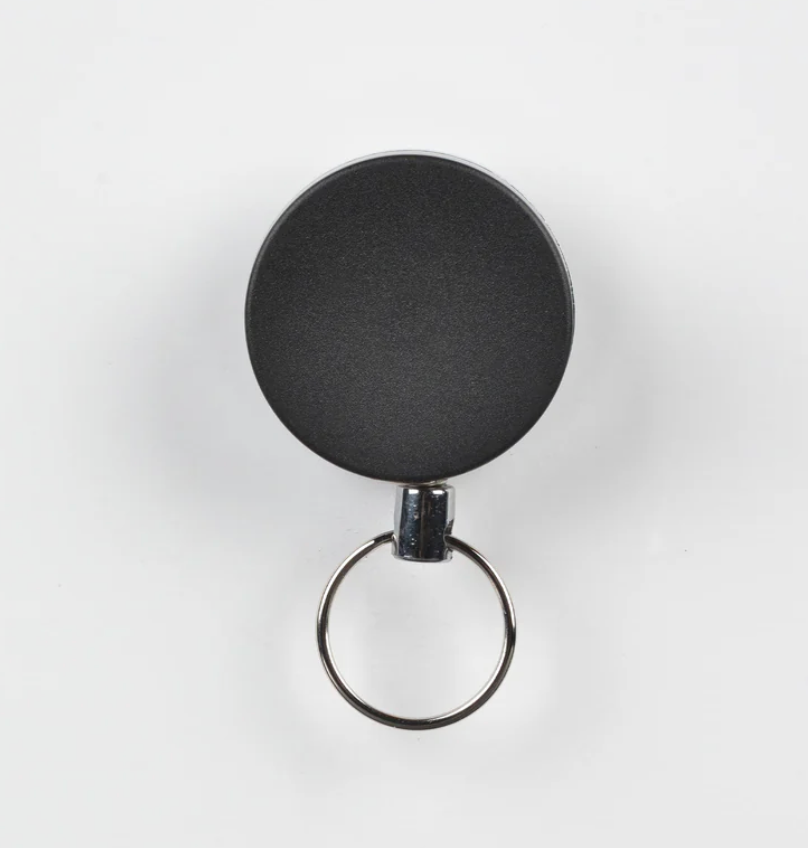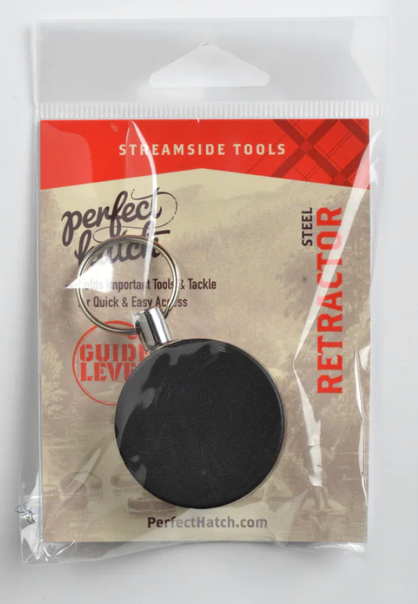 Steel Retractor Black Med: Attaches easily to your fly vest, holds forceps, flashlight, and clippers. Easy access without dropping tools in the water. SS with plenty of durable cord.