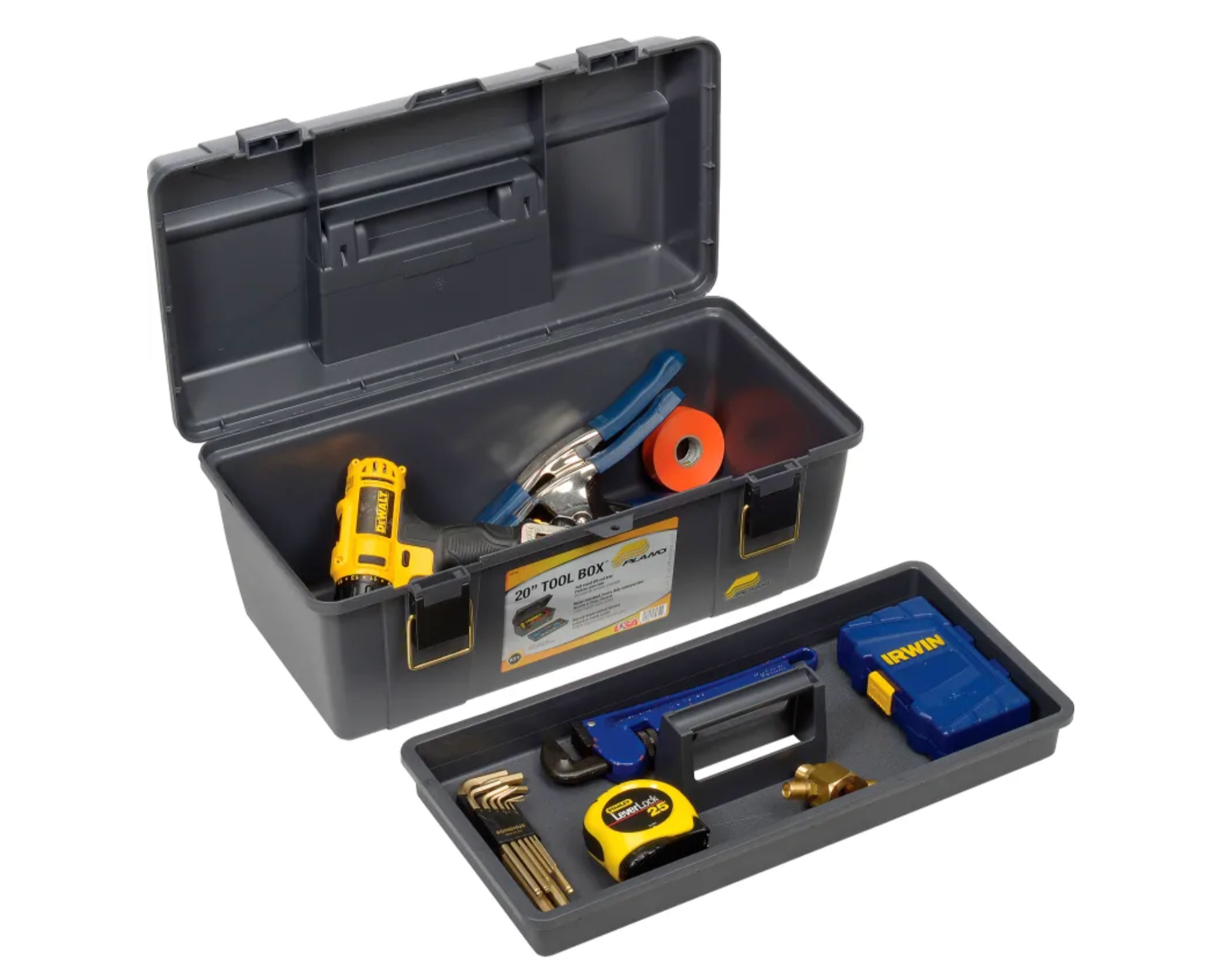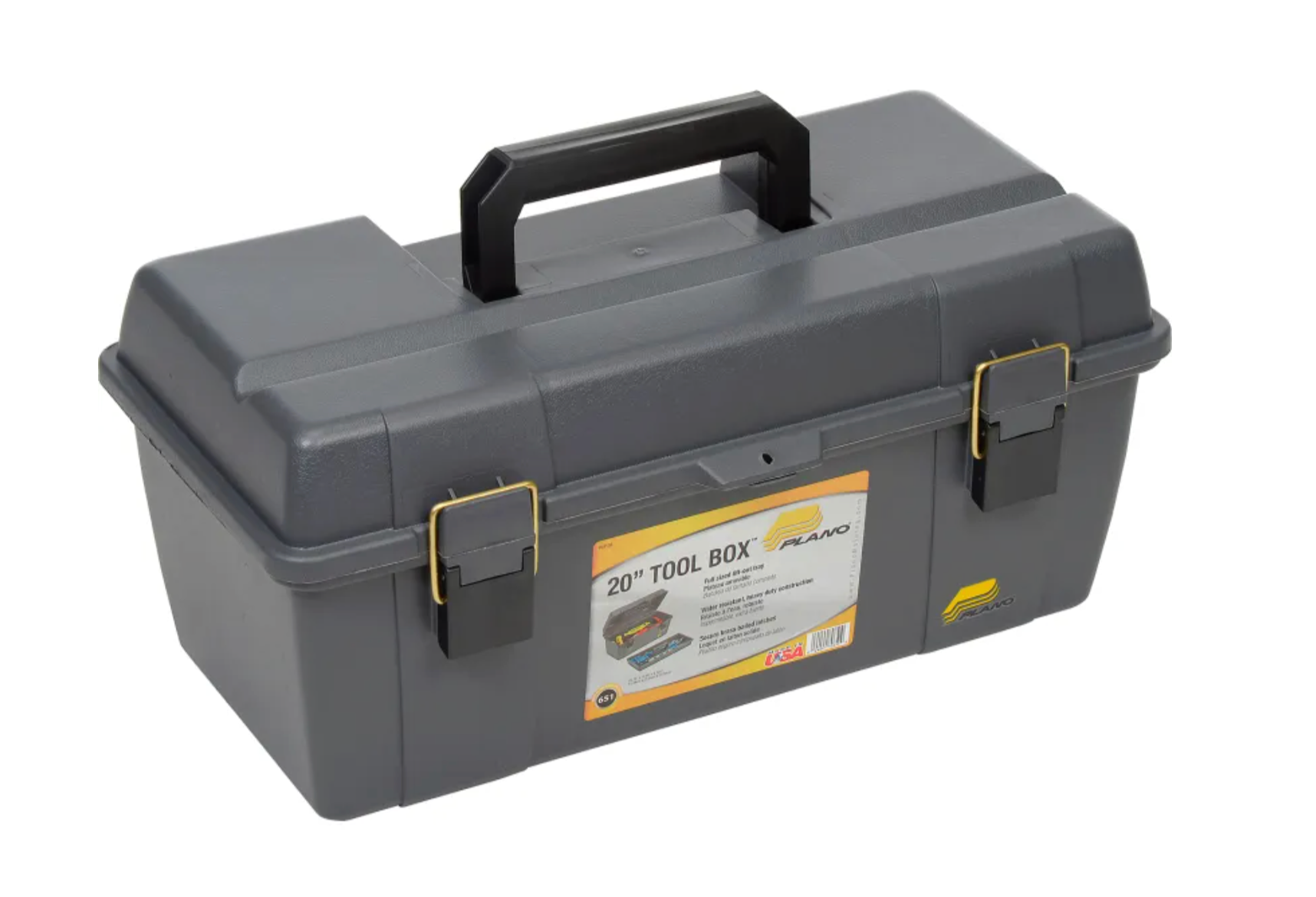 Plano's 20 inch Tool Box with lift-out tray is great for storing tools and small parts. The bulk storage compartment in the base is ideal for larger items, while the sturdy tray holds frequently used essentials. The heavy-duty carry handle and secure brass bailed latches make transportation easy. The molded padlock tab allows you to add an extra layer of security.