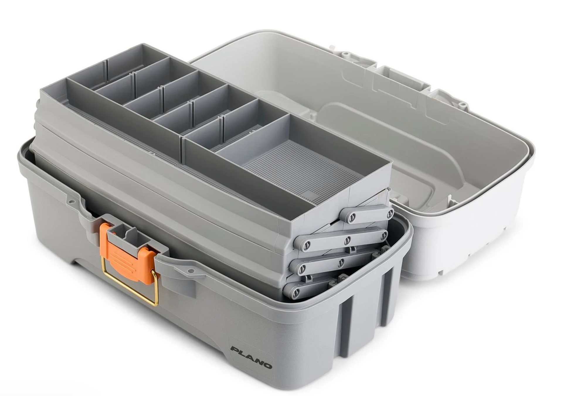 Plano's classic tray tackle box is a staple for every angler. You'll know it's a Plano when you hear the sturdy snap of the brass-bailed latch. The popular tackle box features trays with adjustable compartments and plenty of bulk storage below. On the lid, two top-access compartments offer additional storage.Trays with adjustable compartments