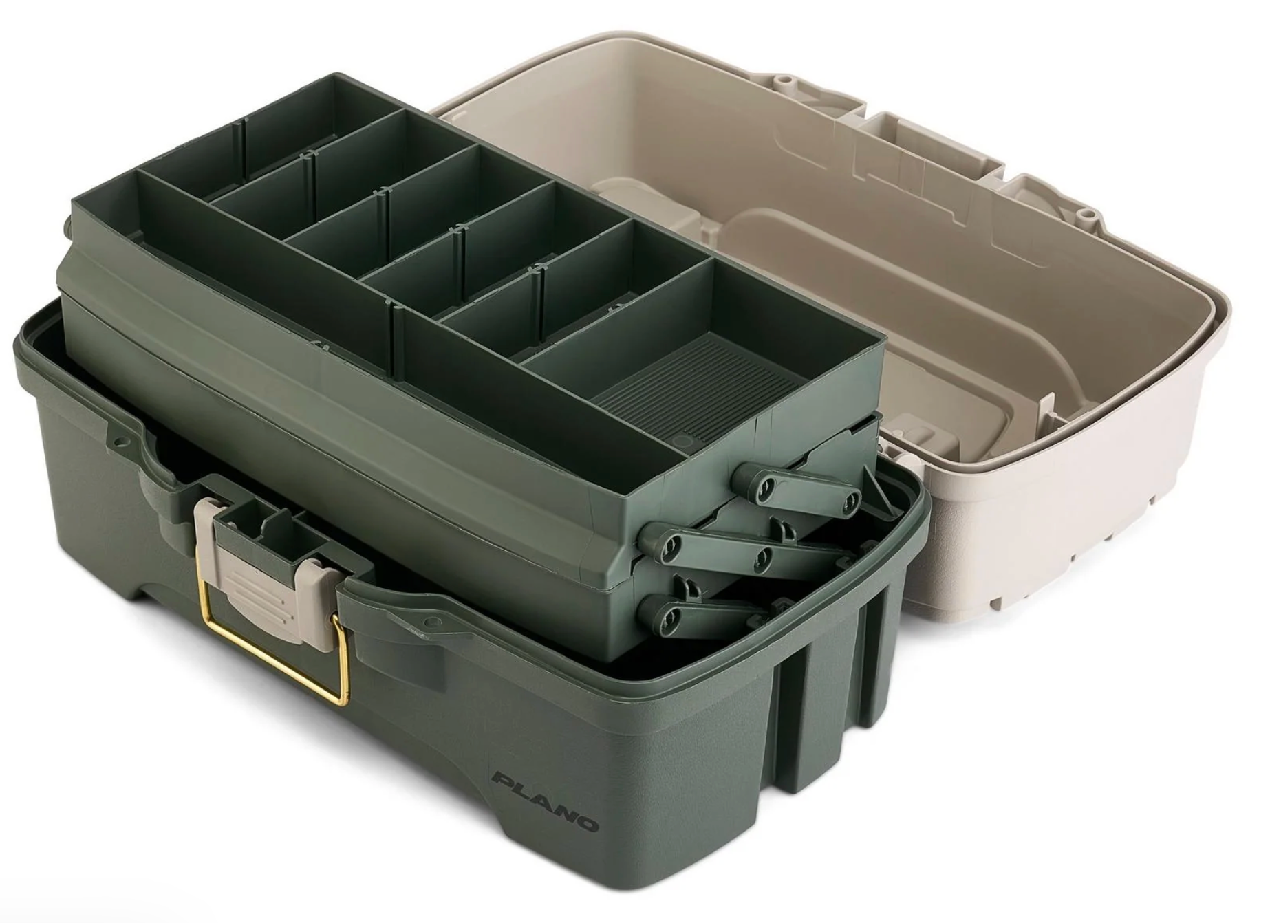 Plano's classic tray tackle box is a staple for every angler. You'll know it's a Plano when you hear the sturdy snap of the brass-bailed latch. The popular tackle box features trays with adjustable compartments and plenty of bulk storage below. On the lid, two top-access compartments offer additional storage.Trays with adjustable compartments