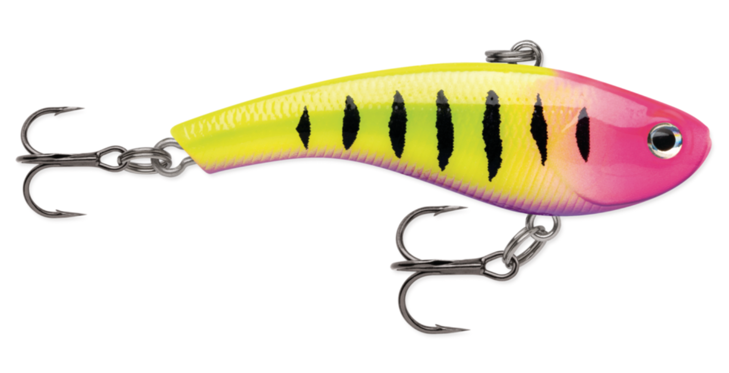 With quick rod snaps the Slab Rap® searches in wide, erratic directions, circling back to center after pause. Lift-drop motion creates subtle vibration on rise, followed by evasive side-to-side motion on the fall. Weight forward design enables a rocking action for triggering negative fish.