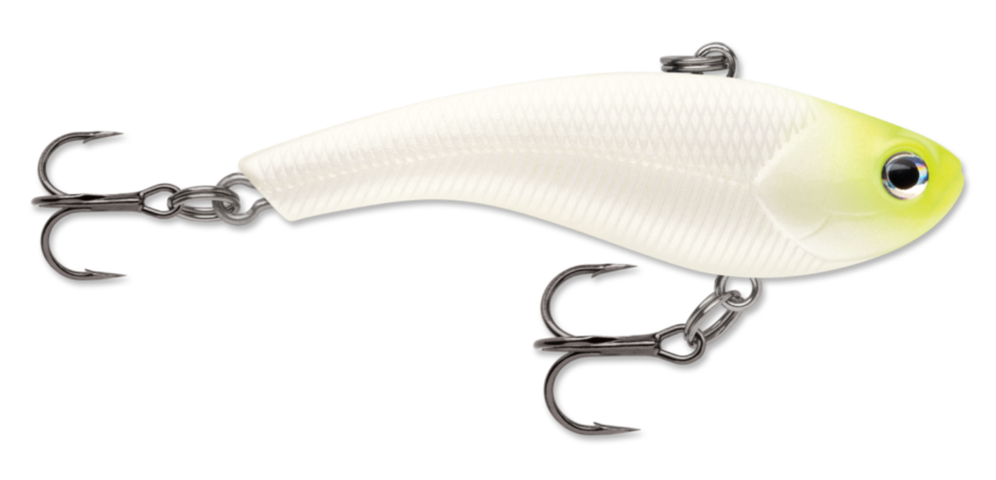 With quick rod snaps the Slab Rap® searches in wide, erratic directions, circling back to center after pause. Lift-drop motion creates subtle vibration on rise, followed by evasive side-to-side motion on the fall. Weight forward design enables a rocking action for triggering negative fish.