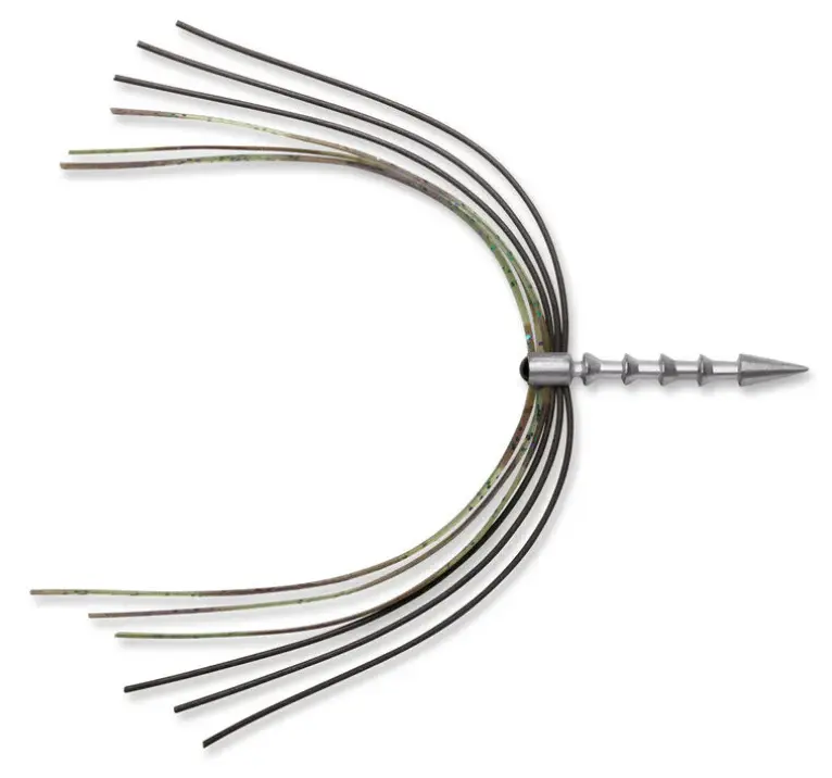 Two-part skirt combining living rubber and silicone material creating a unique action underwater at all temperatures.