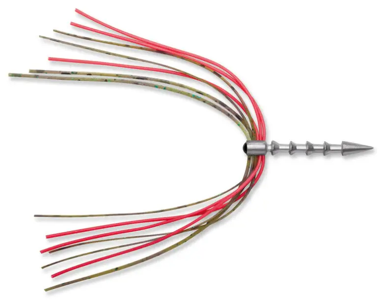 Two-part skirt combining living rubber and silicone material creating a unique action underwater at all temperatures.