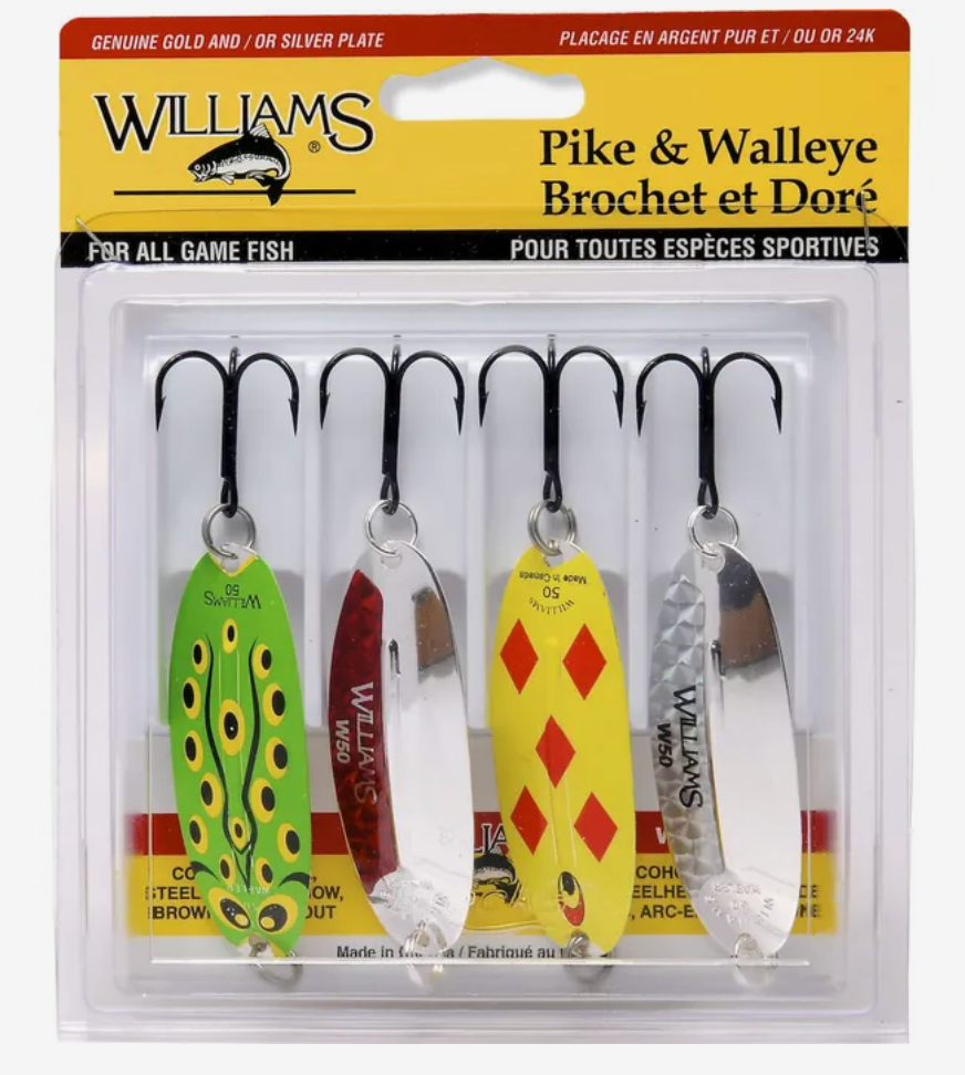 Williams and Mooselook kits have been developed to offer the angler an assortment of proven styles and colours by species and/or by style and size of lure. These lures have been chosen from angler favourites for the species or fisheries they are targeting. Fishing specifically for trout, walleye or pike? Choose from our 4 pack species specific kits like the 4-TK trout, the 4-TTK trout trolling or the 4-PW pike & walleye. Have a favorite lure? Choose from our series kits like the Wabler classics. If stream trout or panfish are your preference, try the 4-W32M. The 4-TK2 Trout and 4-PW2 Pike and Walleye offer anglers an option of more vivid colours in the two most popular kits in the Williams line up. The classic original Wabler is represented in 5 sizes ranging from the small W20 found in the 4-W32M kit through to the lake trout and northern pike favourites, the W50 and W60 sizes found in the 4-50 & 4-60 kits. The W40 is also featured in a classics kit. The W30 is found in the 4-W32M.