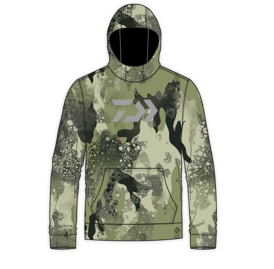 Gray D-VEC hooded fleece sweatshirt made with 70% cotton and 30% polyester. Grey D-VEC logo on front over woods camo with a large grey D-VEC logo on back. The ultimate blend of comfort and function made to keep you warm and focused on fishing.