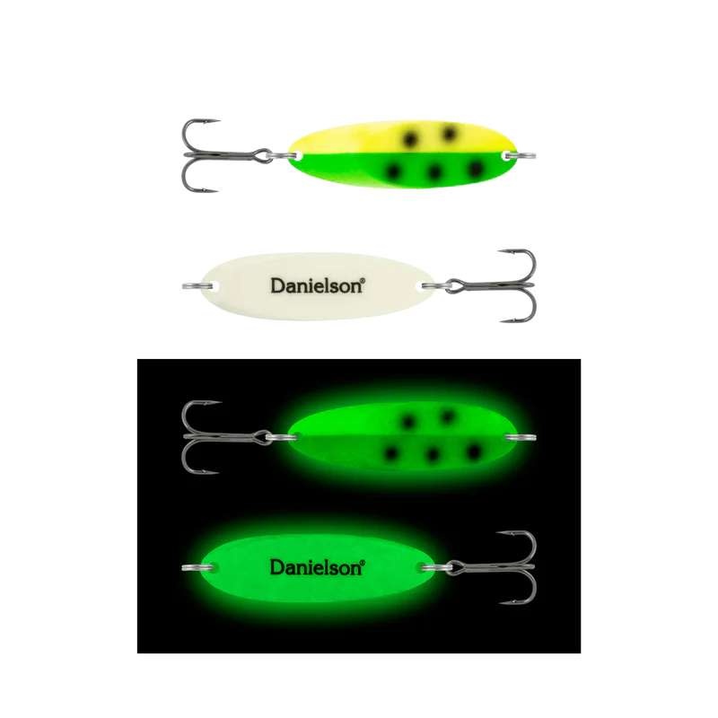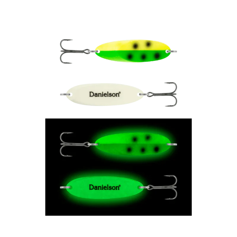 Built to dominate Salmon, Trout and other nocturnal predators. These spoons have full super glow premium paint on the front and back for maximum visibility. Spoons are fully seal coated for maximum durability. 100% brass and built to cast long and retrieve deep. Premium super sharp Danielson hooks for successful hookups.