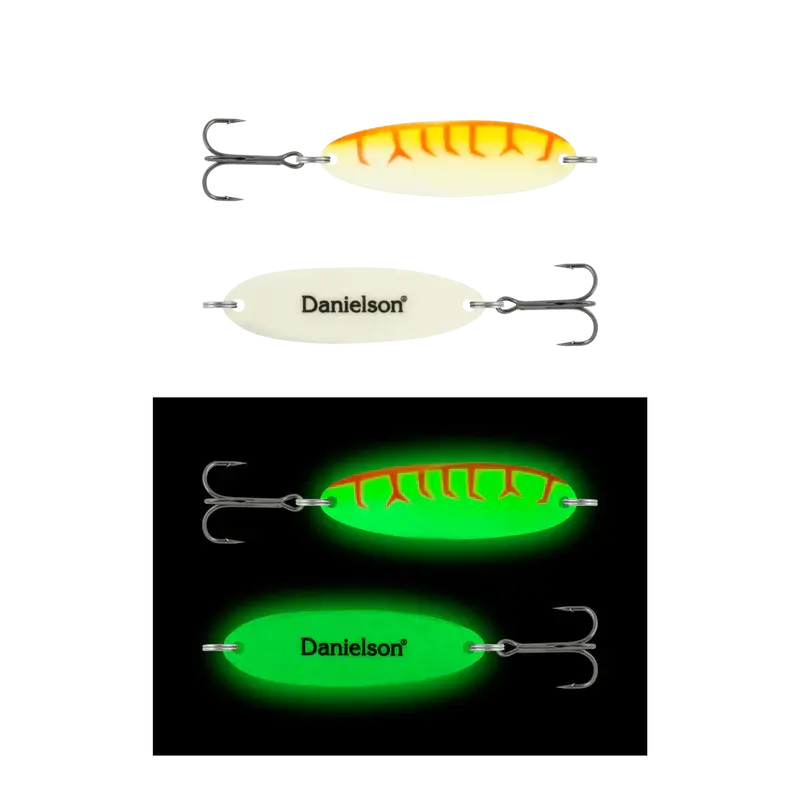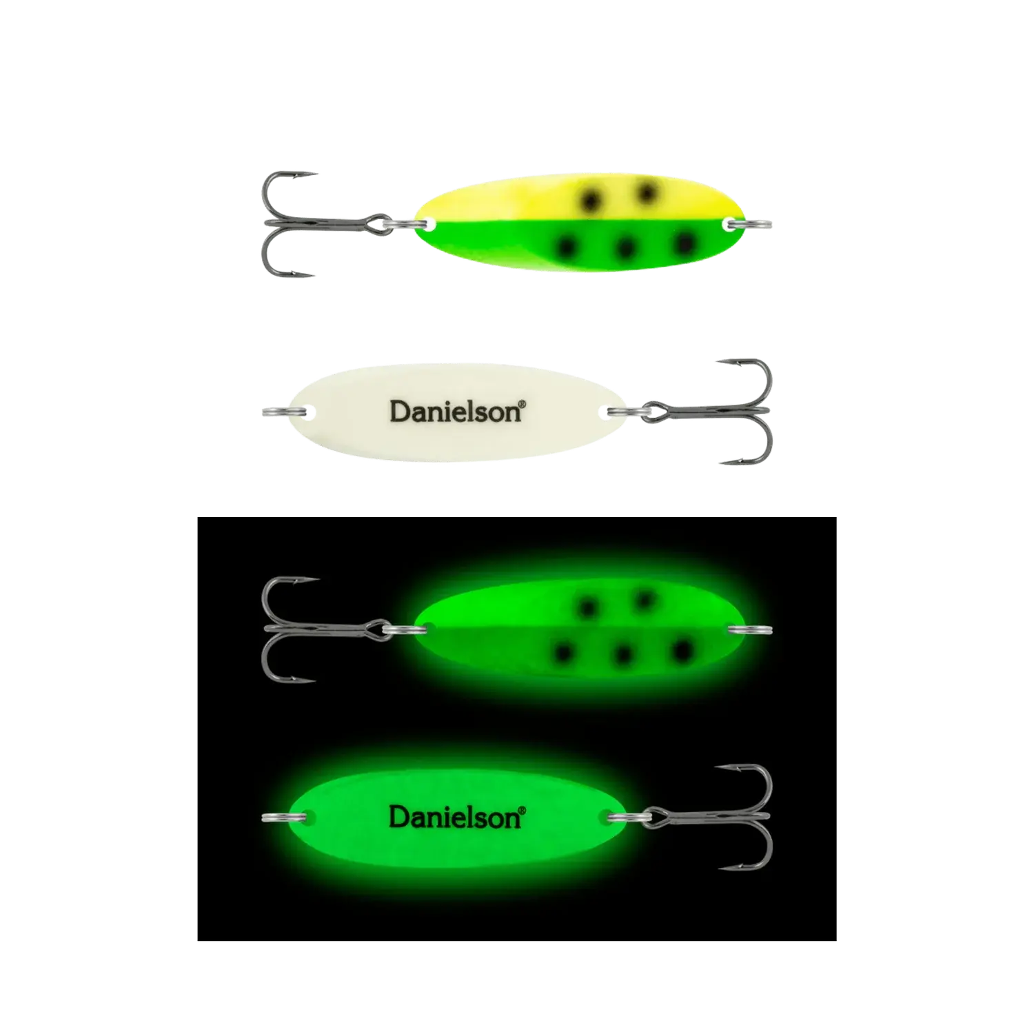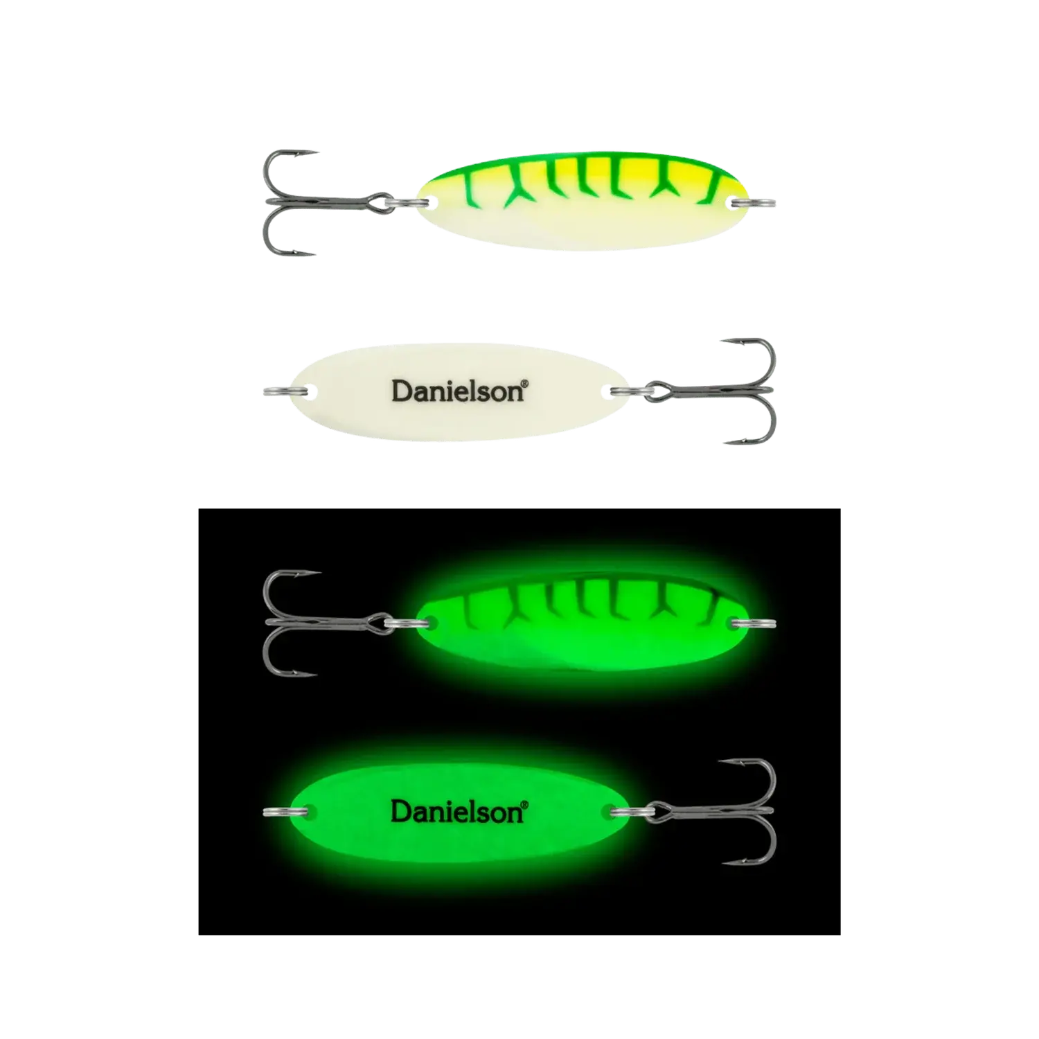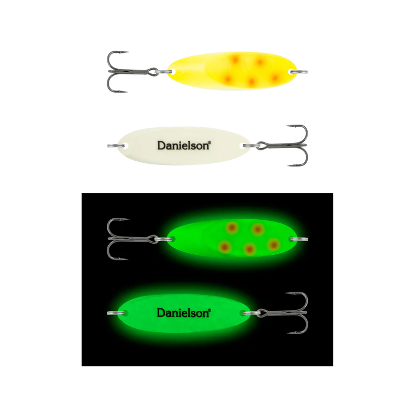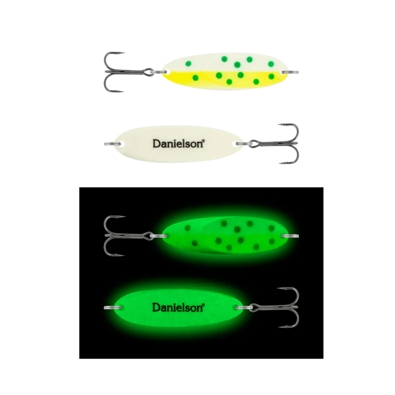 Built to dominate Salmon, Trout and other nocturnal predators. These spoons have full super glow premium paint on the front and back for maximum visibility. Spoons are fully seal coated for maximum durability. 100% brass and built to cast long and retrieve deep. Premium super sharp Danielson hooks for successful hookups.