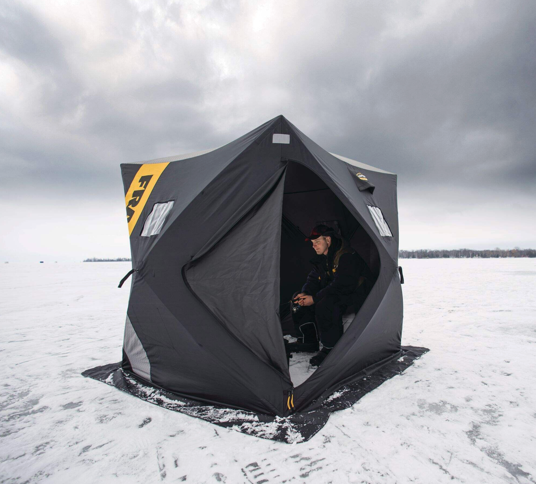 The Frabill Ice Fishing HQ100 Shelter, designed for 1-2 people, provides comfortable protection from harsh winter conditions. Constructed with durable materials and equipped with reinforced corners, this shelter ensures stability and wind resistance on the ice. The roomy interior allows for easy movement and gear storage, while the insulated fabric keeps the interior warm. Ideal for group outings, the Frabill HQ100 Shelter combines functionality and comfort for an enjoyable ice fishing experience.