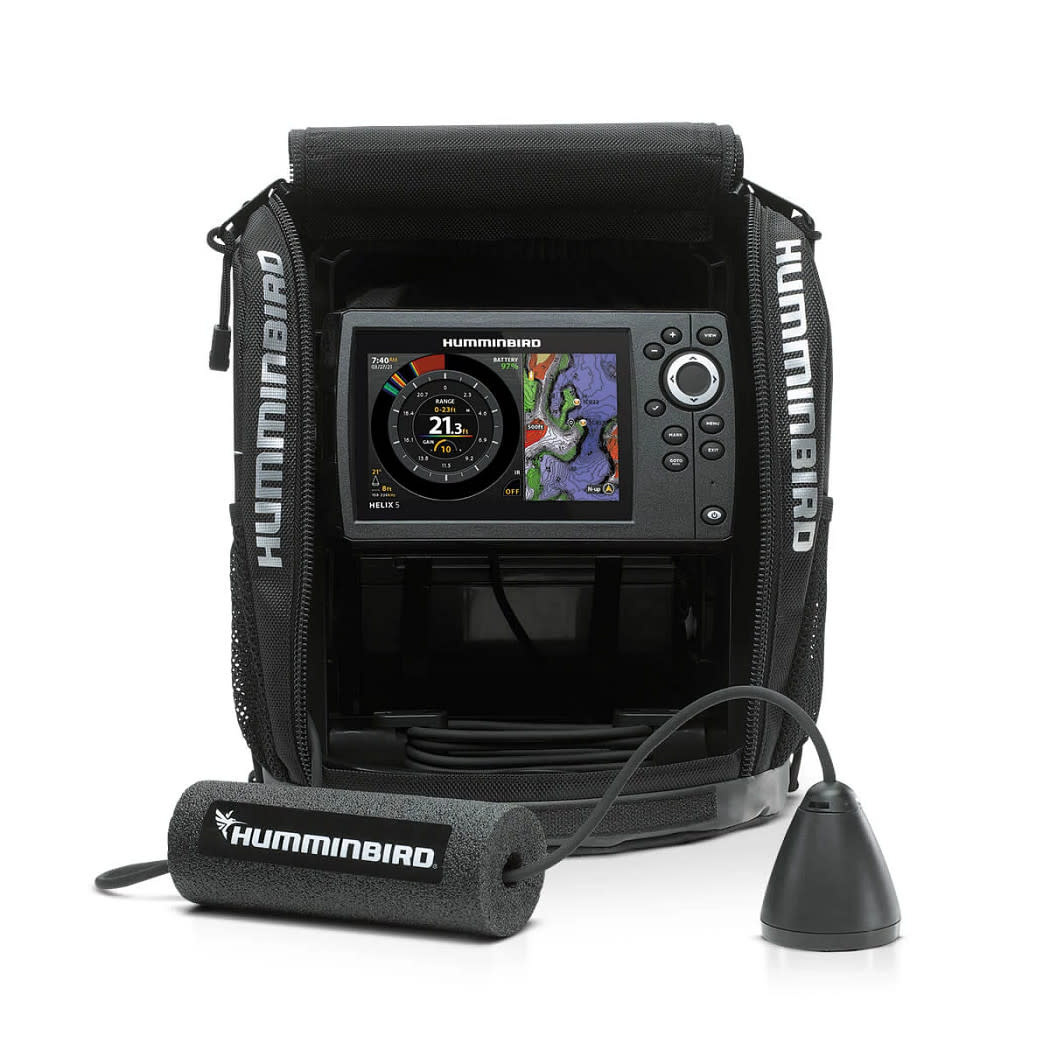 What’s Included: ICE HELIX 5 CHIRP GPS G3 fish finder, Dual Spectrum CHIRP ICE transducer, 9Ah battery and charger, ICE shuttle, hardware, power cable and portable bag.