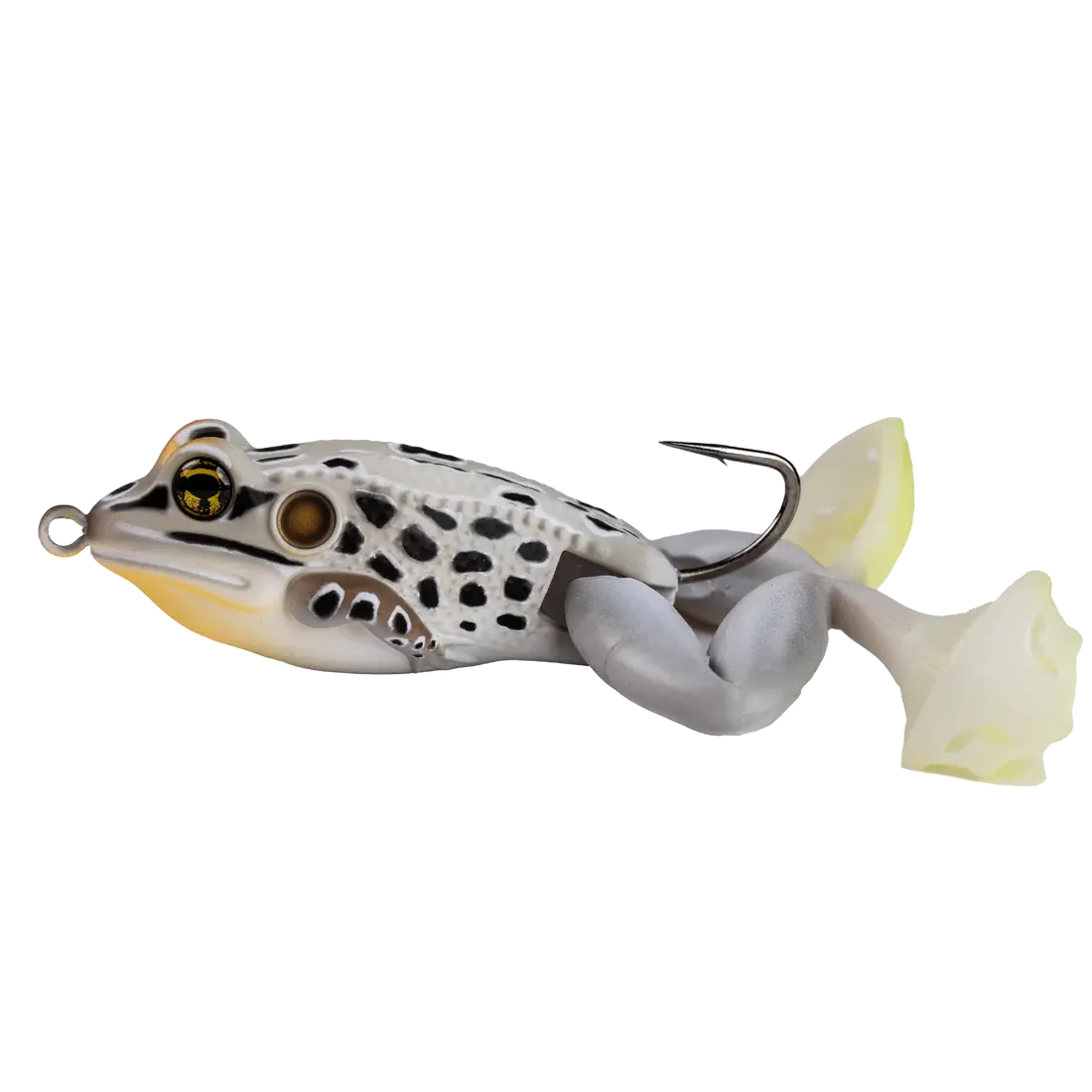 The LIVETARGET Ultimate Frog mimics a vulnerable frog exposed in open water, ready to flight. Pull it to replicate the stride of a fleeing frog. Designed to sit in the water like a resting frog, angle specific. When twitched or pulled, the lure strides forward and the legs stretch just like a frog thrusting forward. The legs hinge at the hips, creating an anatomical stridelike action. The body is made from ABS and the legs are made from TPE. Pulls through cover with ease. This Finesse Model is stealthy in open runs, or throw it in small holes around heavy mat cover. Sold with one set of replacement legs to ensure lure longevity. Ideal for targeting Bass, Pike and other surface feeding predators