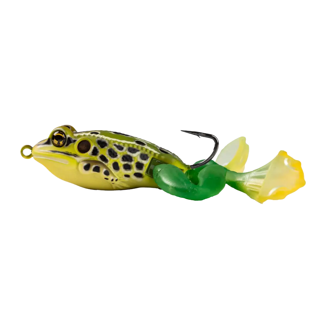 The LIVETARGET Ultimate Frog mimics a vulnerable frog exposed in open water, ready to flight. Pull it to replicate the stride of a fleeing frog. Designed to sit in the water like a resting frog, angle specific. When twitched or pulled, the lure strides forward and the legs stretch just like a frog thrusting forward. The legs hinge at the hips, creating an anatomical stridelike action. The body is made from ABS and the legs are made from TPE. Pulls through cover with ease. This Finesse Model is stealthy in open runs, or throw it in small holes around heavy mat cover. Sold with one set of replacement legs to ensure lure longevity. Ideal for targeting Bass, Pike and other surface feeding predators