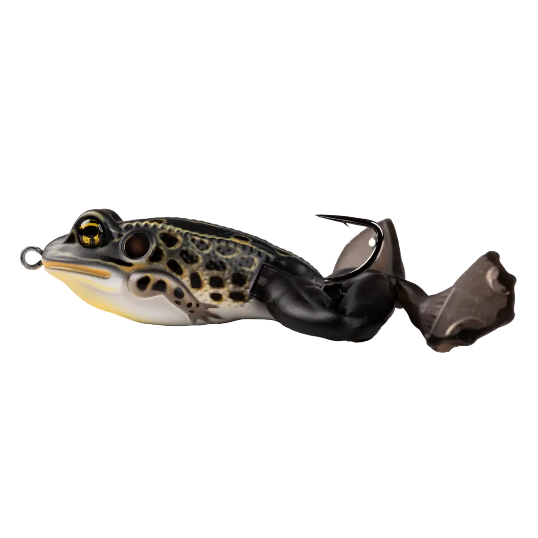 The LIVETARGET Ultimate Frog mimics a vulnerable frog exposed in open water, ready to flight. Pull it to replicate the stride of a fleeing frog. Designed to sit in the water like a resting frog, angle specific. When twitched or pulled, the lure strides forward and the legs stretch just like a frog thrusting forward. The legs hinge at the hips, creating an anatomical stridelike action. The body is made from ABS and the legs are made from TPE. Pulls through cover with ease. This Finesse Model is stealthy in open runs, or throw it in small holes around heavy mat cover. Sold with one set of replacement legs to ensure lure longevity. Ideal for targeting Bass, Pike and other surface feeding predators