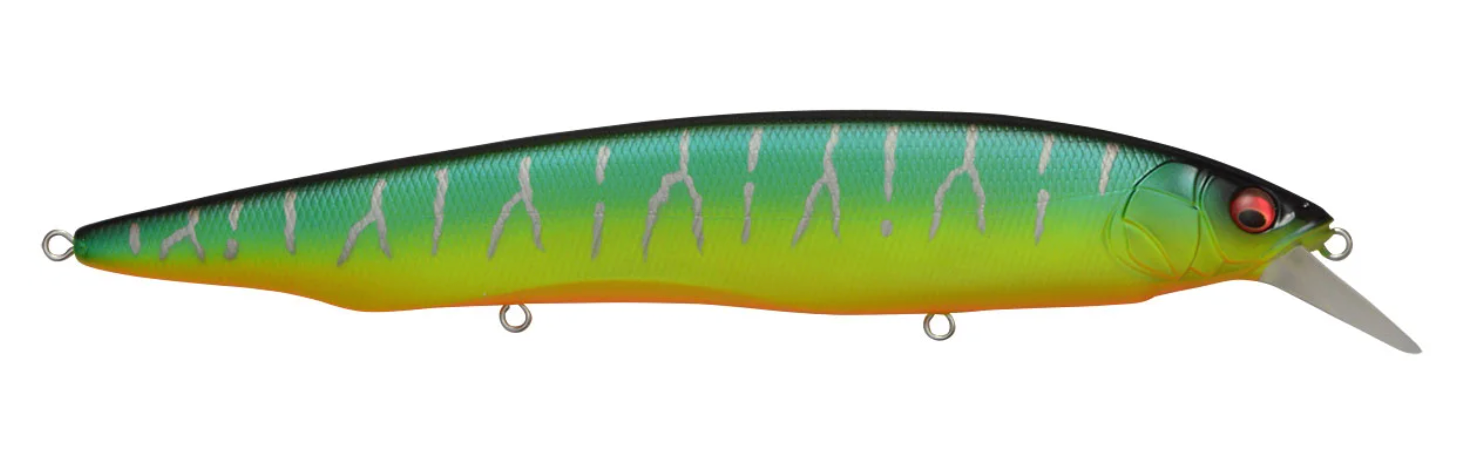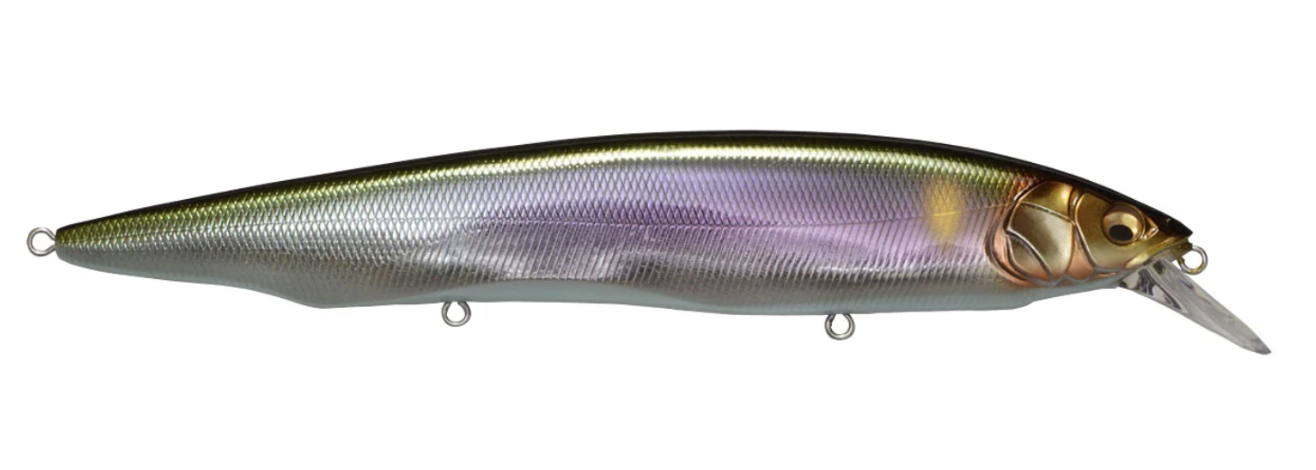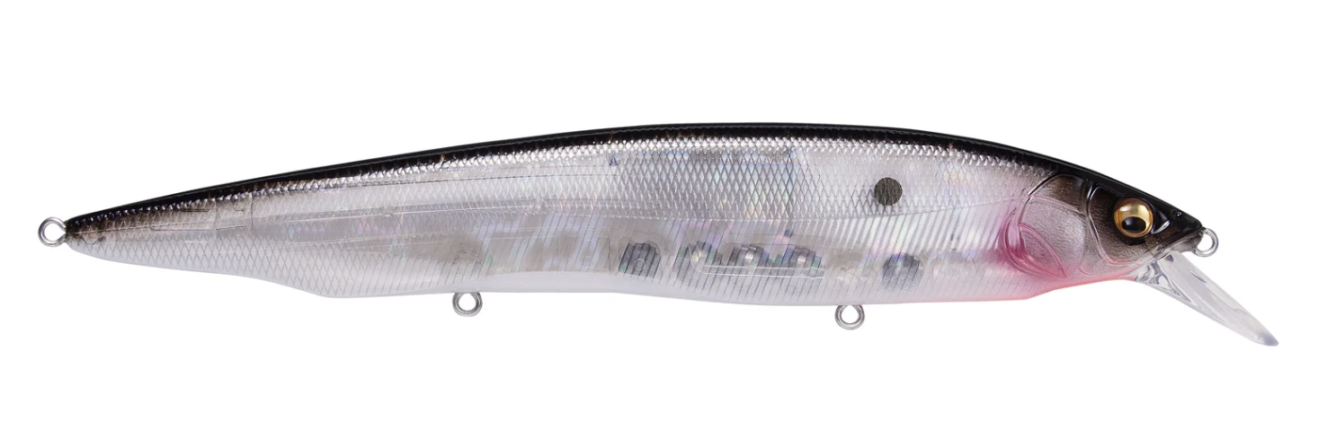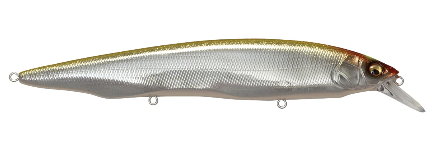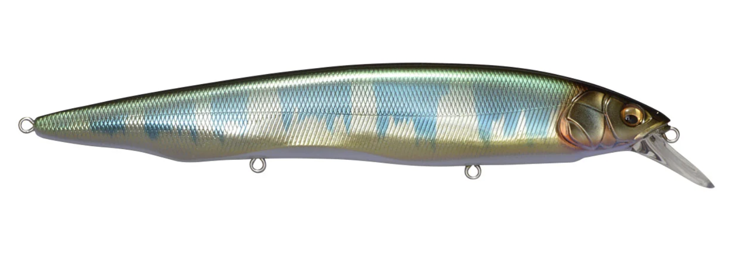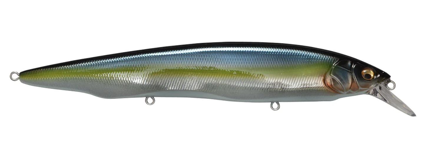 Tempting fish that are keyed-in on larger bait, the Megabass Kanata Jerkbait offers a large, attention-grabbing 6-1/3” profile with the action the match. Built with finely tuned flat sides, the Megabass Kanata Jerkbait produces a monstrous flash, whether it is burned over grass beds or worked like a traditional jerkbait.Moving through the water with minimal resistance thanks to its streamlined body, the Megabass Kanata Jerkbatit allows for a fast, action-packed retrieve that will not put undue stress on your wrist or forearm. Sharp rod work fuels an energetic darting action, kicking side-to-side with huge water displacement and less forward travel than an Ito Vision 110. On the pause, the Megabass Kanata Jerkbait lifts its head and rises, adding a unique action to the mix.