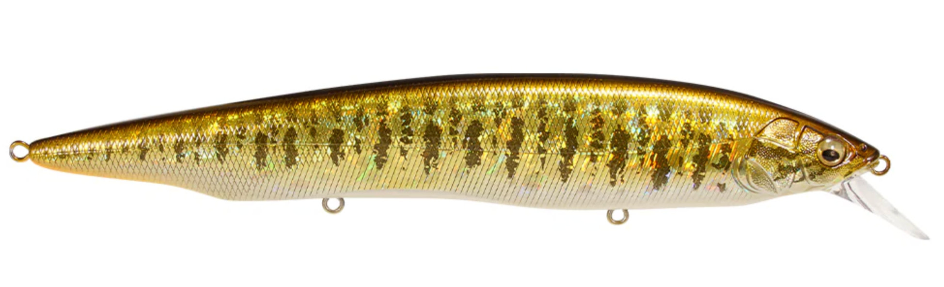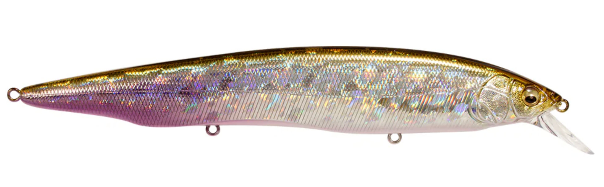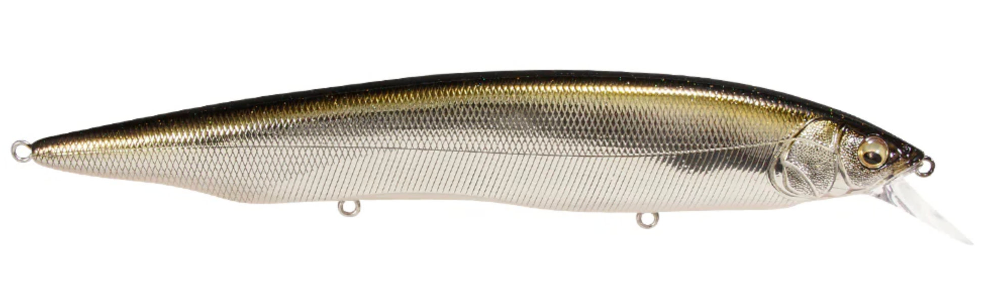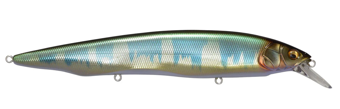Tempting fish that are keyed-in on larger bait, the Megabass Kanata Jerkbait offers a large, attention-grabbing 6-1/3” profile with the action the match. Built with finely tuned flat sides, the Megabass Kanata Jerkbait produces a monstrous flash, whether it is burned over grass beds or worked like a traditional jerkbait.Moving through the water with minimal resistance thanks to its streamlined body, the Megabass Kanata Jerkbatit allows for a fast, action-packed retrieve that will not put undue stress on your wrist or forearm. Sharp rod work fuels an energetic darting action, kicking side-to-side with huge water displacement and less forward travel than an Ito Vision 110. On the pause, the Megabass Kanata Jerkbait lifts its head and rises, adding a unique action to the mix.