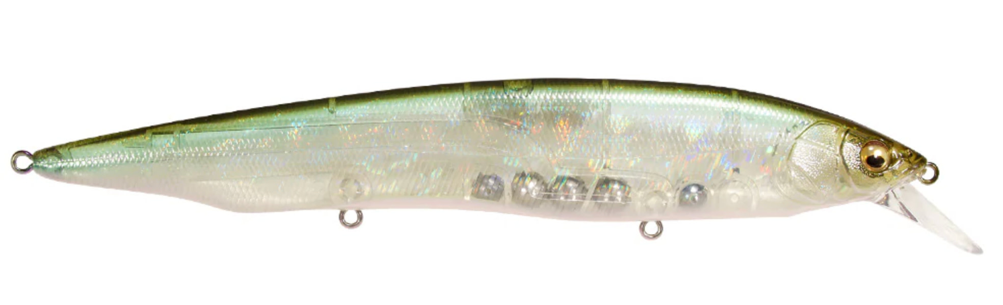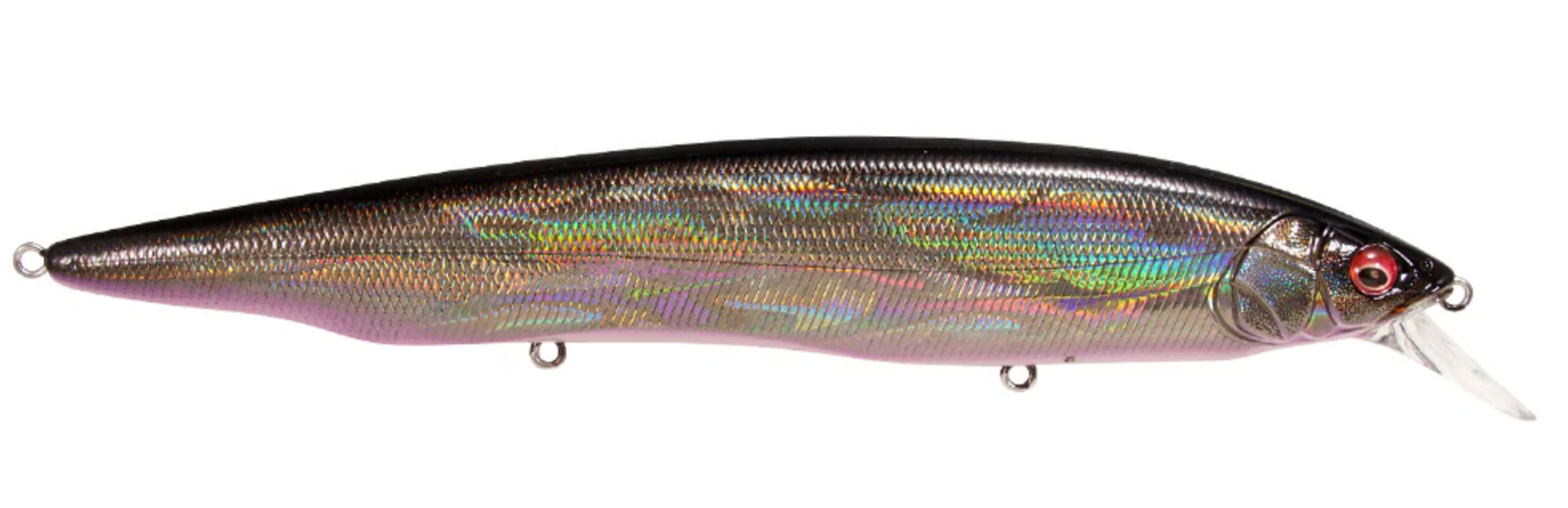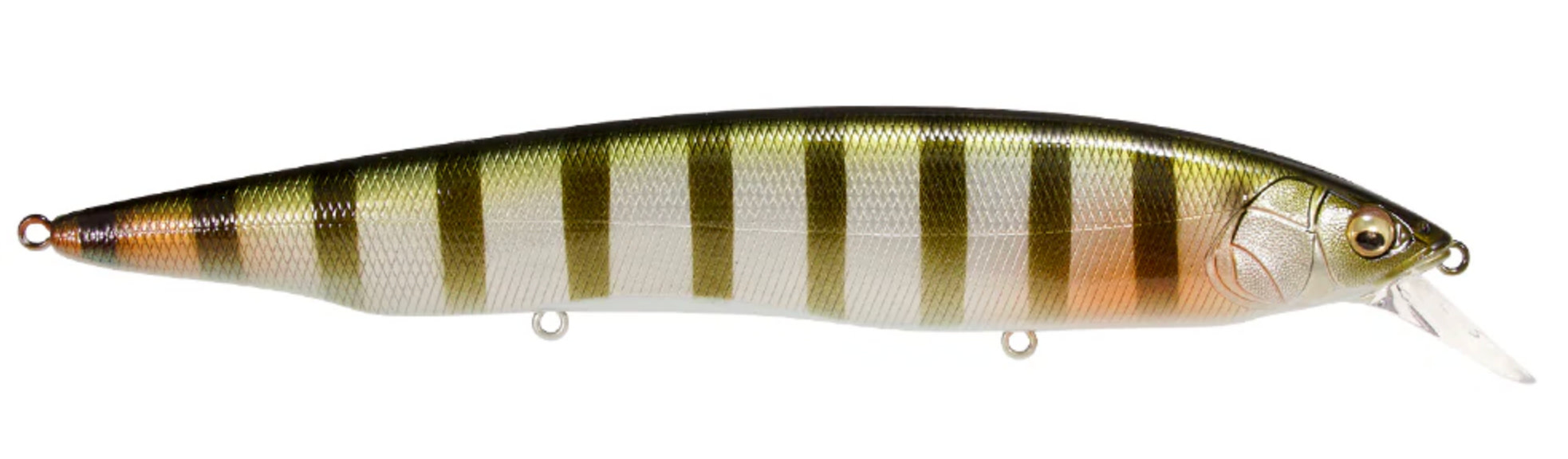 Tempting fish that are keyed-in on larger bait, the Megabass Kanata Jerkbait offers a large, attention-grabbing 6-1/3” profile with the action the match. Built with finely tuned flat sides, the Megabass Kanata Jerkbait produces a monstrous flash, whether it is burned over grass beds or worked like a traditional jerkbait.Moving through the water with minimal resistance thanks to its streamlined body, the Megabass Kanata Jerkbatit allows for a fast, action-packed retrieve that will not put undue stress on your wrist or forearm. Sharp rod work fuels an energetic darting action, kicking side-to-side with huge water displacement and less forward travel than an Ito Vision 110. On the pause, the Megabass Kanata Jerkbait lifts its head and rises, adding a unique action to the mix.