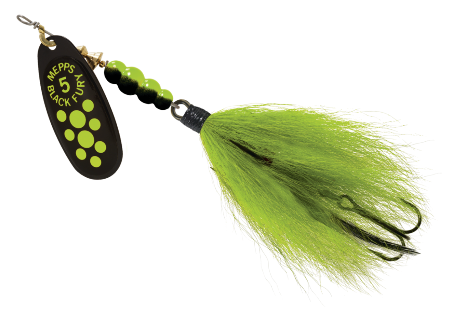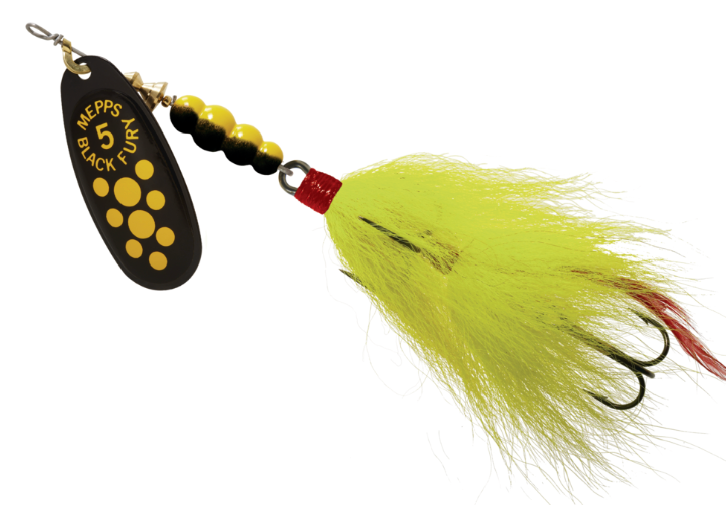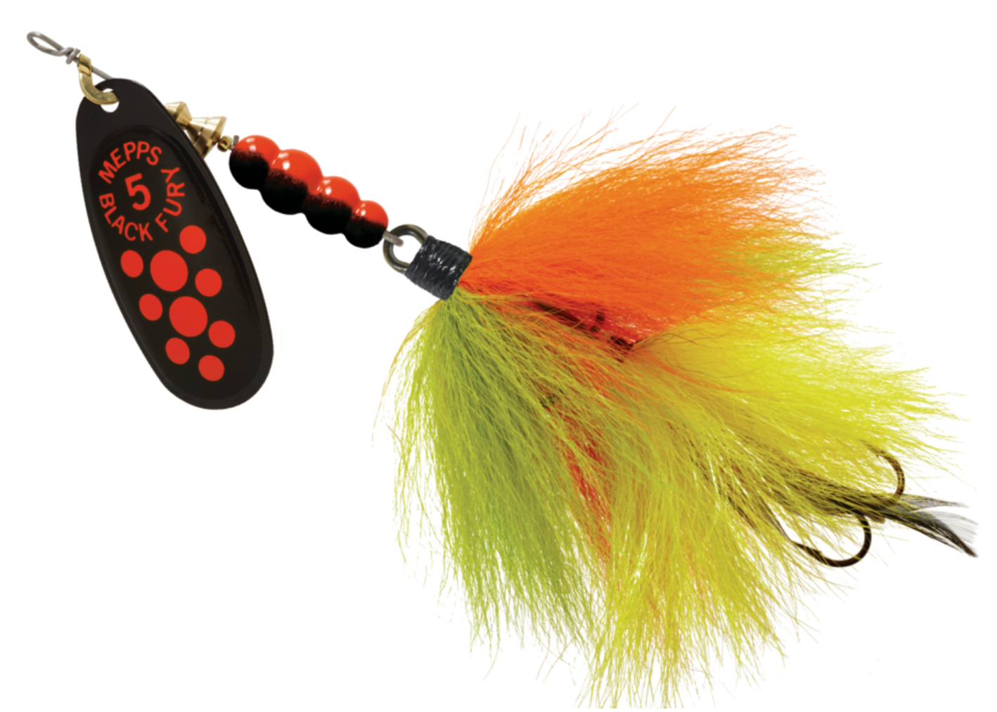 The Black Fury Tandem® BF5TB offers the same advantages with a medium running course. A #1/0 bronze treble with a #2 treble hook trailer, perfect for those short strikes. The hook dressing is genuine bucktail dyed in brilliant proven fish catching patterns. This bait is to be thrown on medium to heavy spinning gear and built strong enough to withstand solid hits from big northerns.