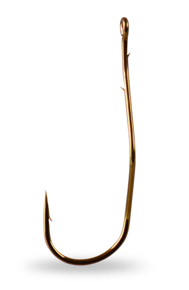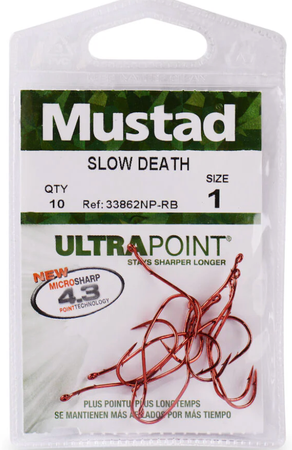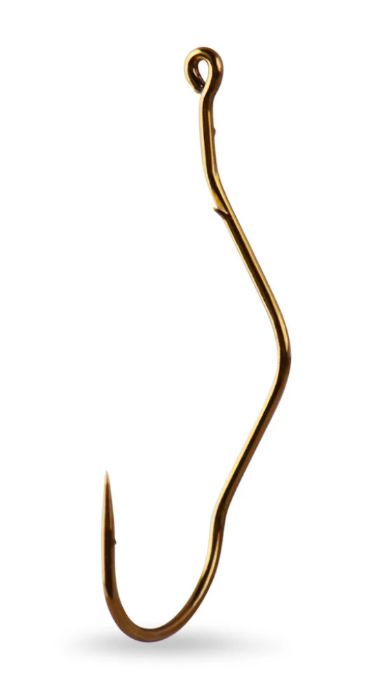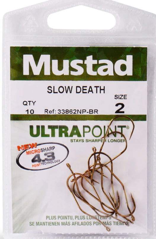 The Slow Death® Aberdeen Hook is an Aberdeen style pattern with a special kinked shank that, when threaded with half of a nightcrawler/earthworm and trolled at slow speeds, produces a wild, intense action and reaches areas that blade presentations typically won't reach. This is a versatile technique in which the unique hook design creates an enticing corkscrew presentation that lets you present the bait in cracks, crevices and little corners that faster blade presentations skip. To set up the rig, attach a bottom-bouncer weight to your main line. Tie a 48”/122 cm mono or fluorocarbon leader to the bottom of bottom-bouncer. Thread half a night crawler/earthworm up the hook shank and over the hook eye. There should be up to 1/2"/1,5cm of nightcrawler/earthworm hanging off the hook. Row or use a trolling motor at speeds from 1mph/1kn to almost nothing, keeping just enough speed so the crawler spins. Use it to target Walleye, Bass, Crappie, Perch or Panfish.