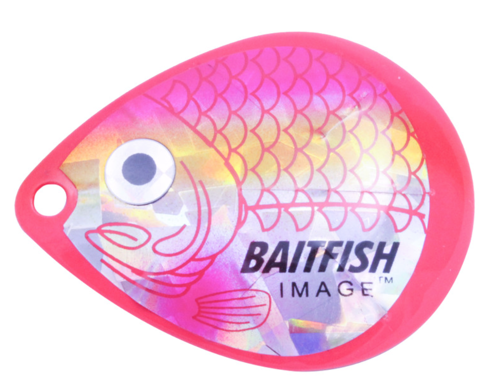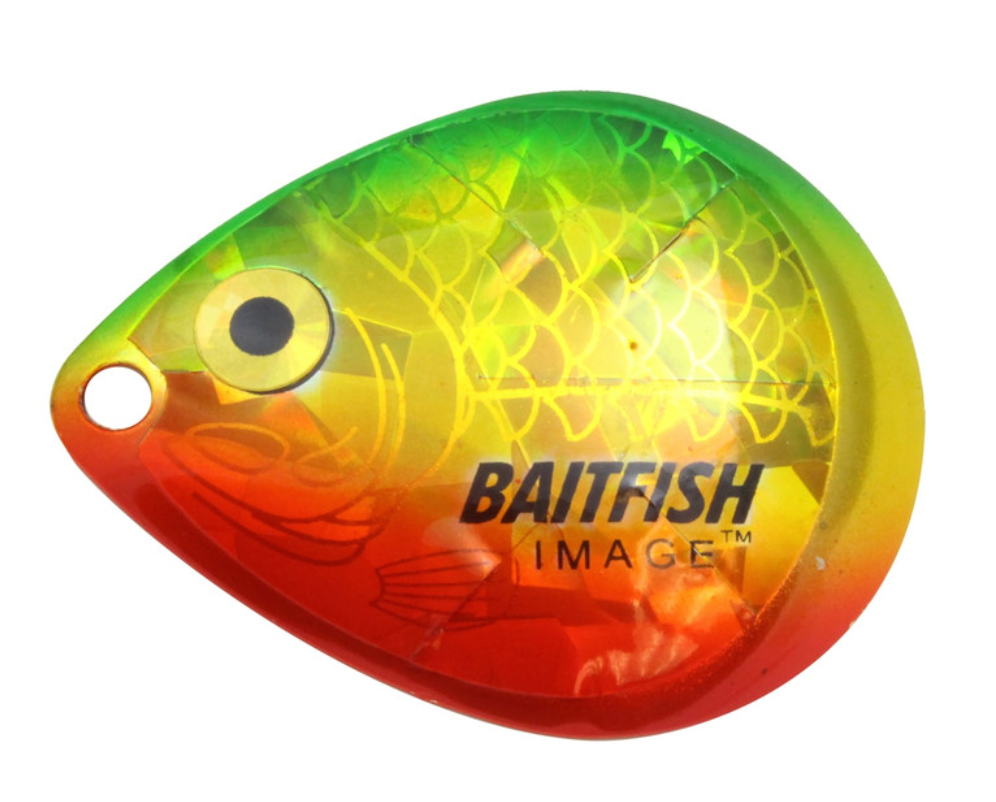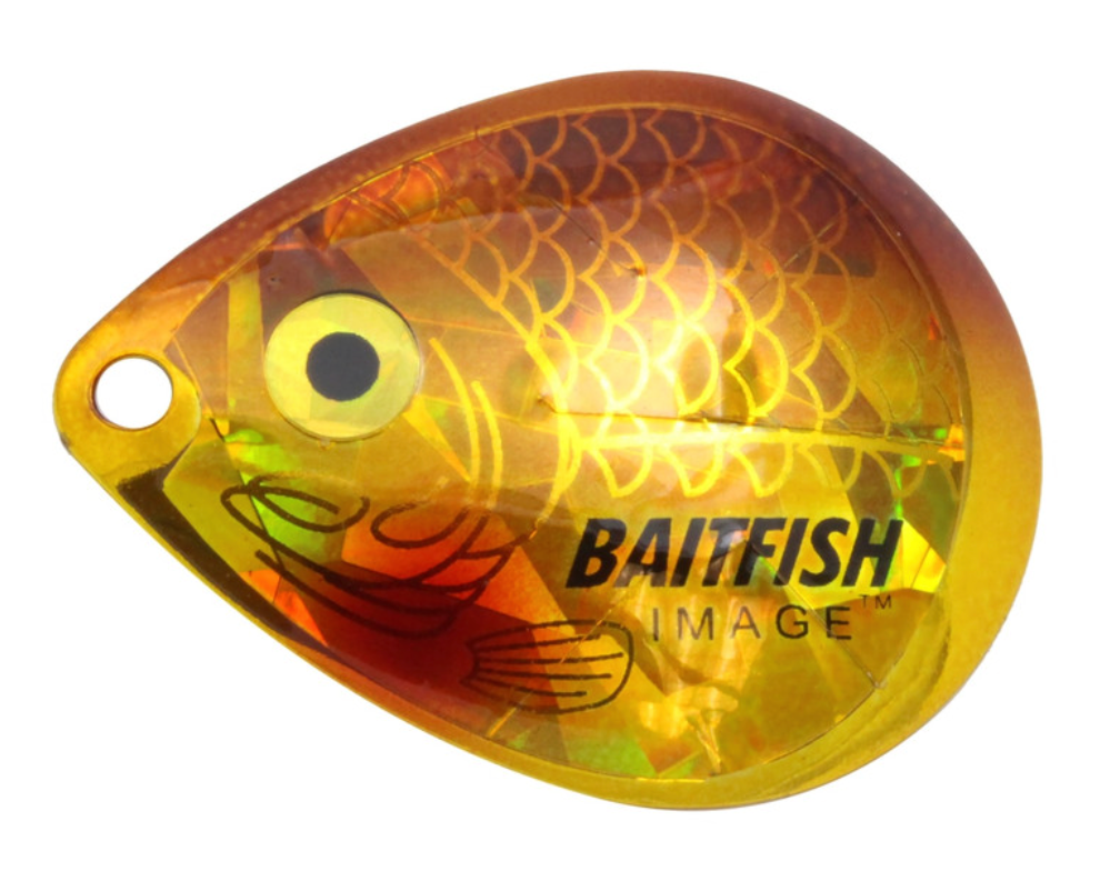 Proven to consistently catch walleyes, jumbo perch and other gamefish. Deeply cupped, slow-revolving design produces maximum flash, sound and vibration to attract predators in all conditions. Choose “holographic” Baitfish-Image® colour patterns to mimic preferred forage. Great for use with spinner rigs, spinnerbaits and blade baits.