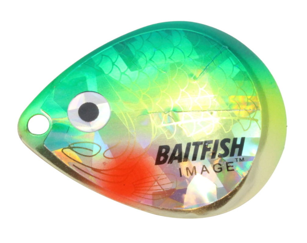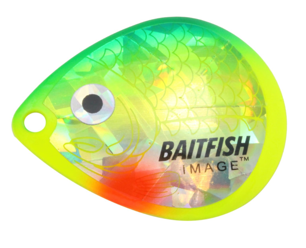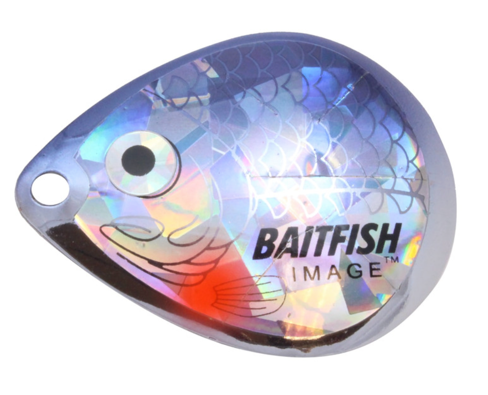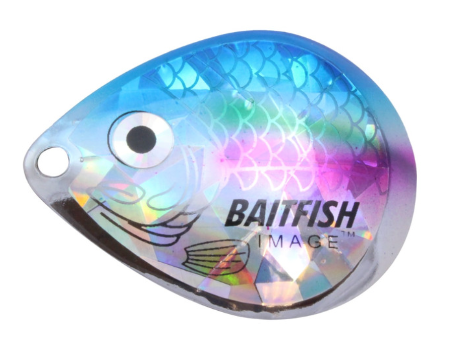Proven to consistently catch walleyes, jumbo perch and other gamefish. Deeply cupped, slow-revolving design produces maximum flash, sound and vibration to attract predators in all conditions. Choose “holographic” Baitfish-Image® colour patterns to mimic preferred forage. Great for use with spinner rigs, spinnerbaits and blade baits.