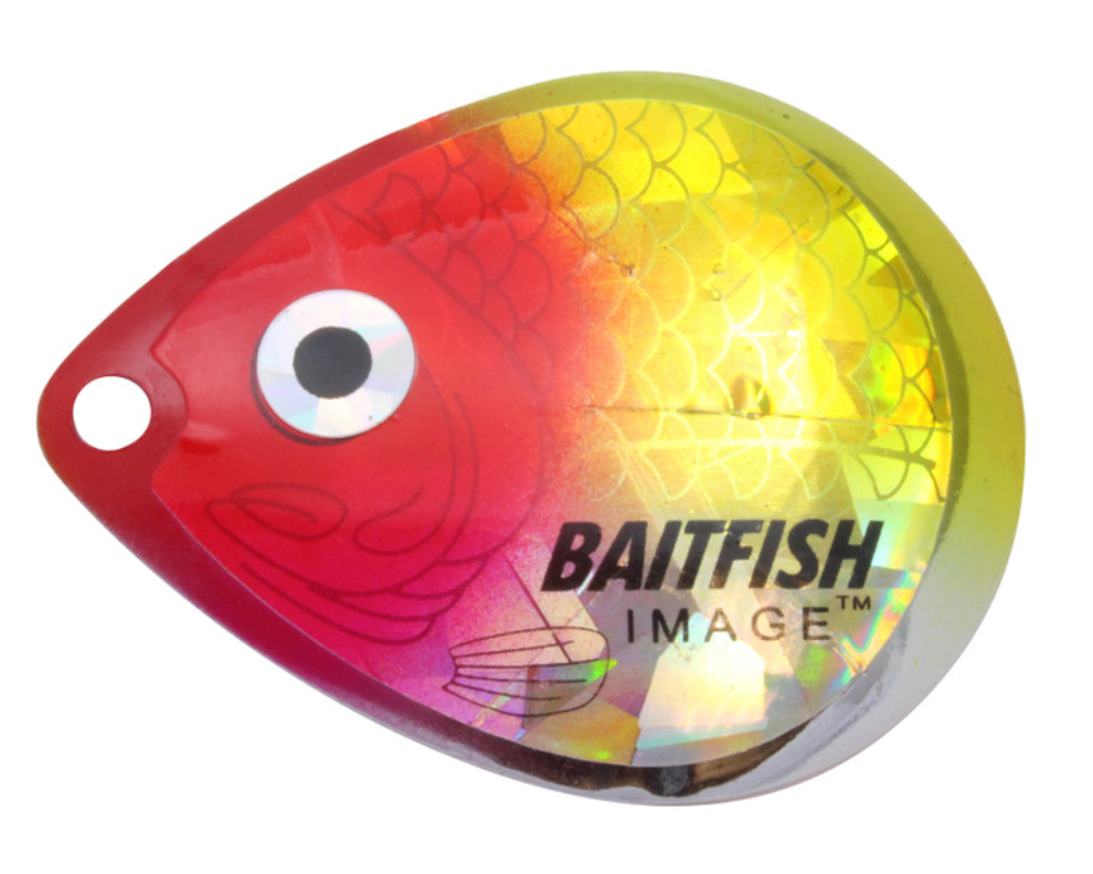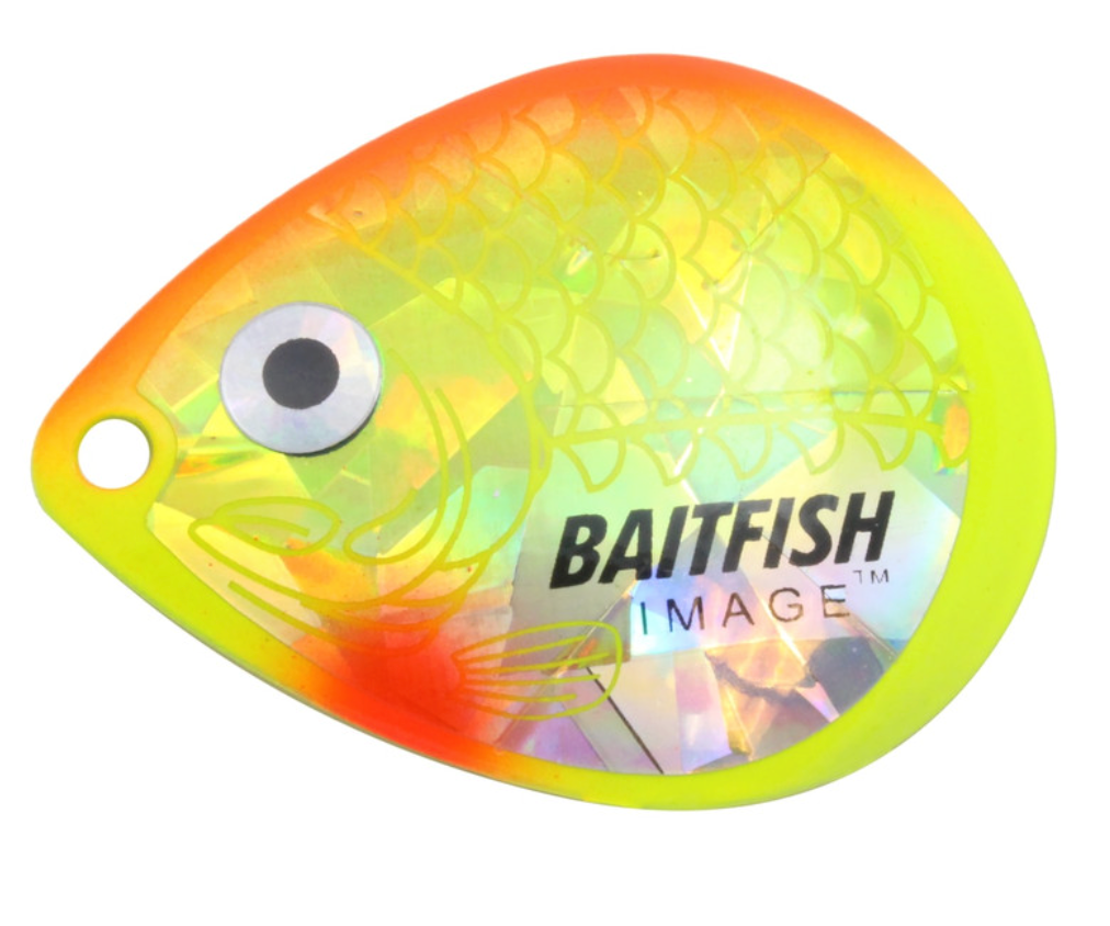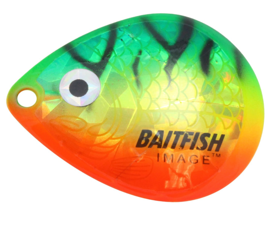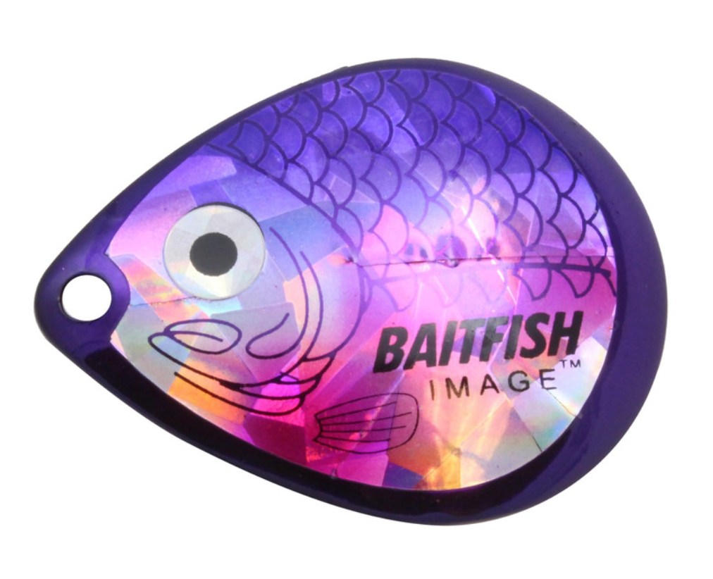Proven to consistently catch walleyes, jumbo perch and other gamefish. Deeply cupped, slow-revolving design produces maximum flash, sound and vibration to attract predators in all conditions. Choose “holographic” Baitfish-Image® colour patterns to mimic preferred forage. Great for use with spinner rigs, spinnerbaits and blade baits.