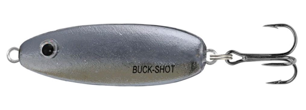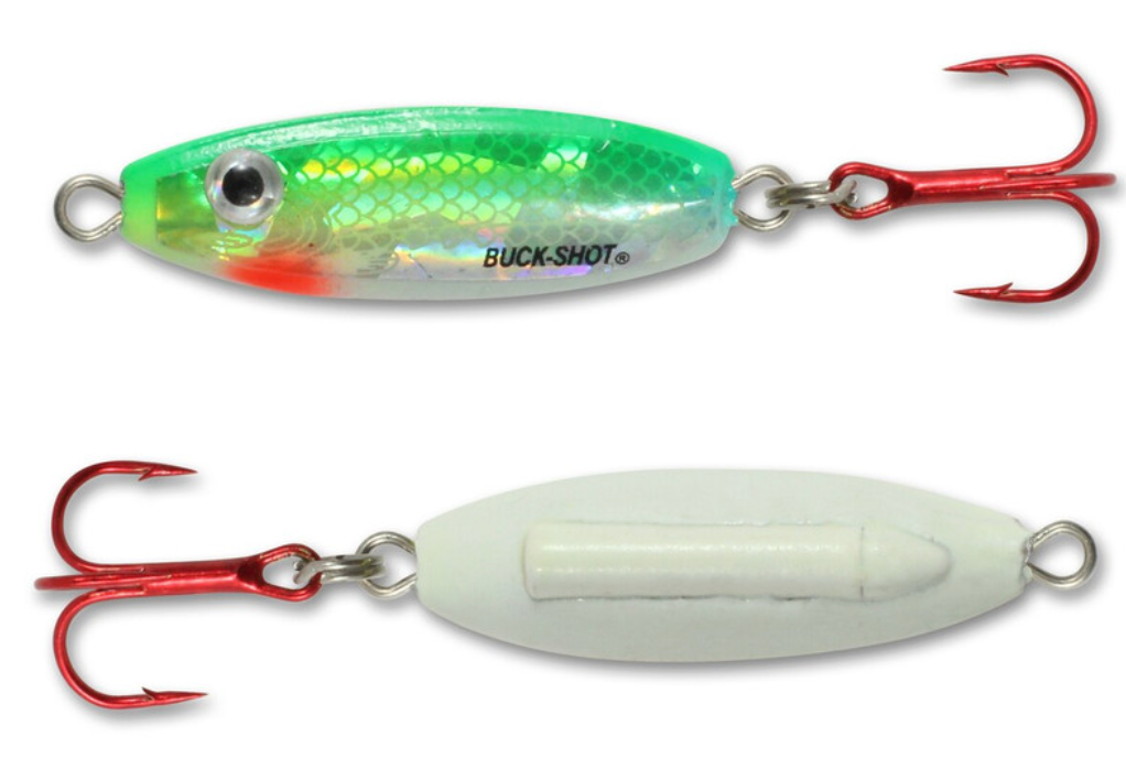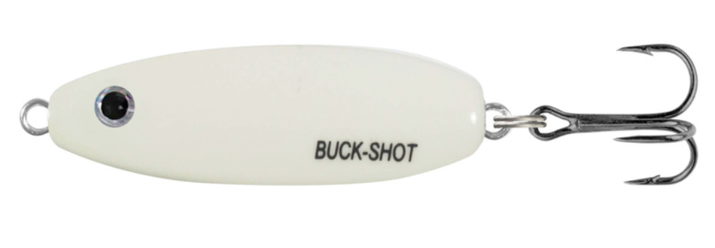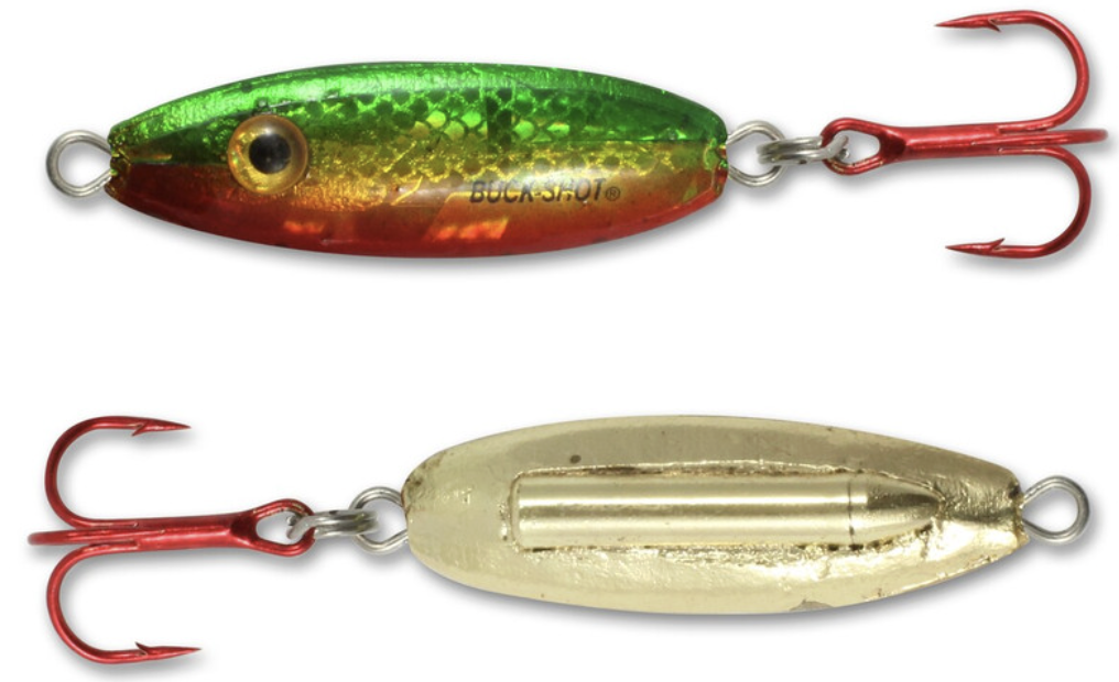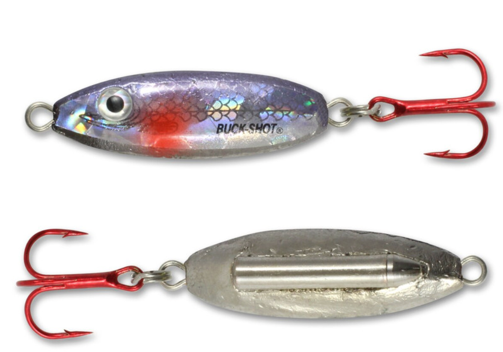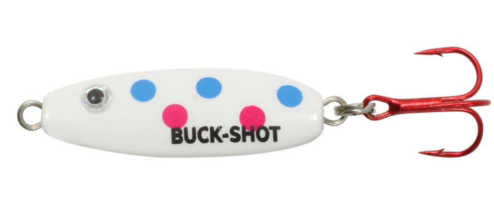 The Buck-Shot® Rattle Spoon is deadly in both hard and open water fishing for vertical jigging perch, walleye, trout, bass and pike. Jig aggressively in a lift-fall manner to call fish from a wide radius and make them strike. Tip with your favorite live baits like minnow heads and wax worms. The UV Buck-Shot® Spoon is finished with a highly-visible UV enhanced optically enhanced brightener visible to fish in the darkest of water. The ticking, thumping and clicking Buck-Shot® Rattle gets the attention of fish from a wide radius. The UV attraction combined with fish-attracting “feeding” sounds along with the Tiger Striped pattern results in a deadly mix that’s guaranteed to put fish on the ice.