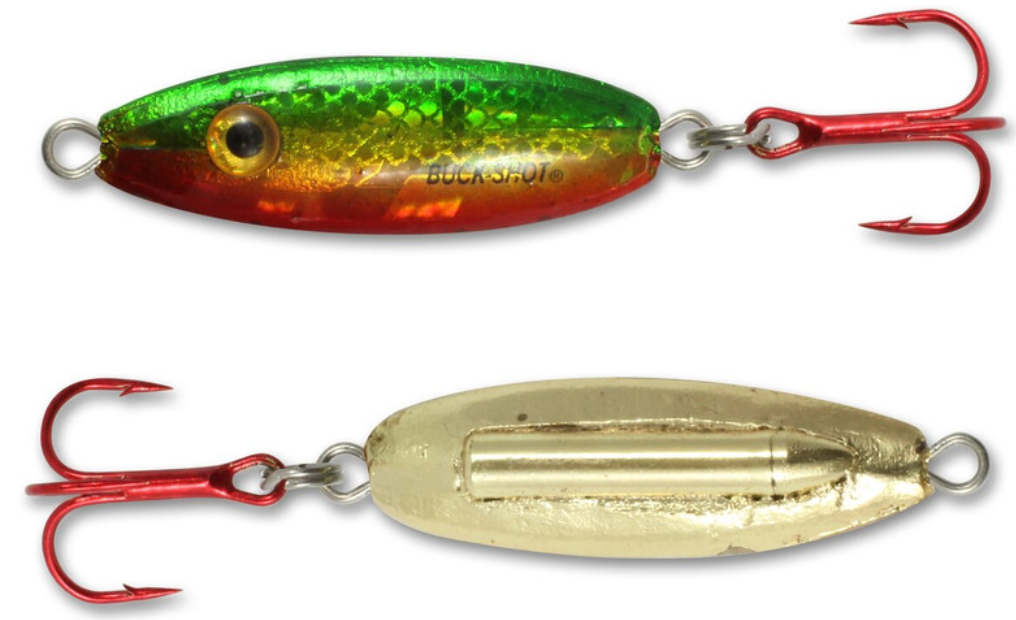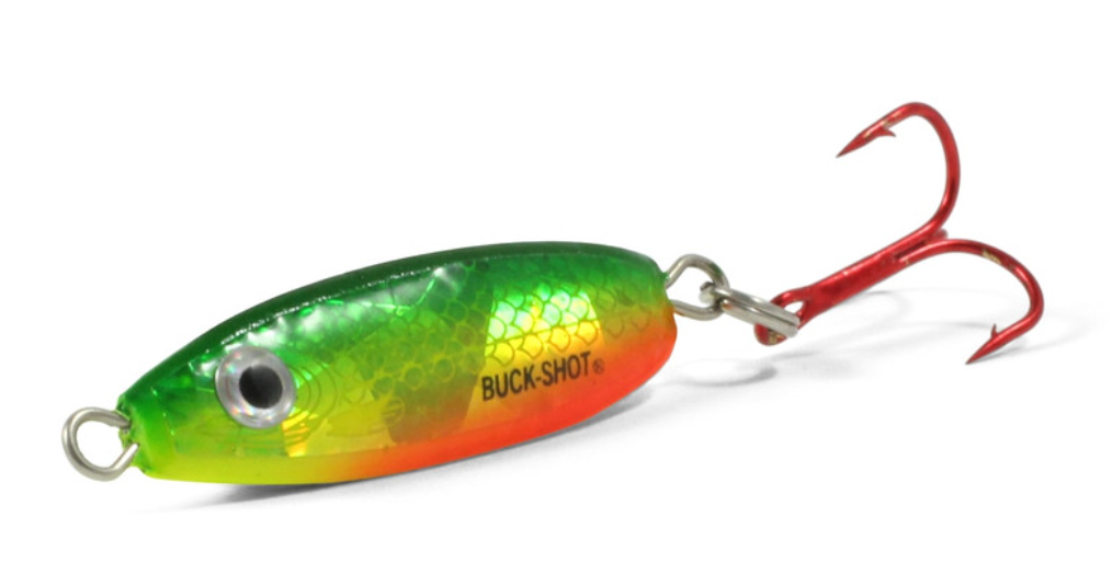 The Buck-Shot® Rattle Spoon is deadly in both hard and open water fishing for vertical jigging perch, walleye, trout, bass and pike. Jig aggressively in a lift-fall manner to call fish from a wide radius and make them strike. Tip with your favorite live baits like minnow heads and wax worms. The UV Buck-Shot® Spoon is finished with a highly-visible UV enhanced optically enhanced brightener visible to fish in the darkest of water. The ticking, thumping and clicking Buck-Shot® Rattle gets the attention of fish from a wide radius. The UV attraction combined with fish-attracting “feeding” sounds along with the Tiger Striped pattern results in a deadly mix that’s guaranteed to put fish on the ice.