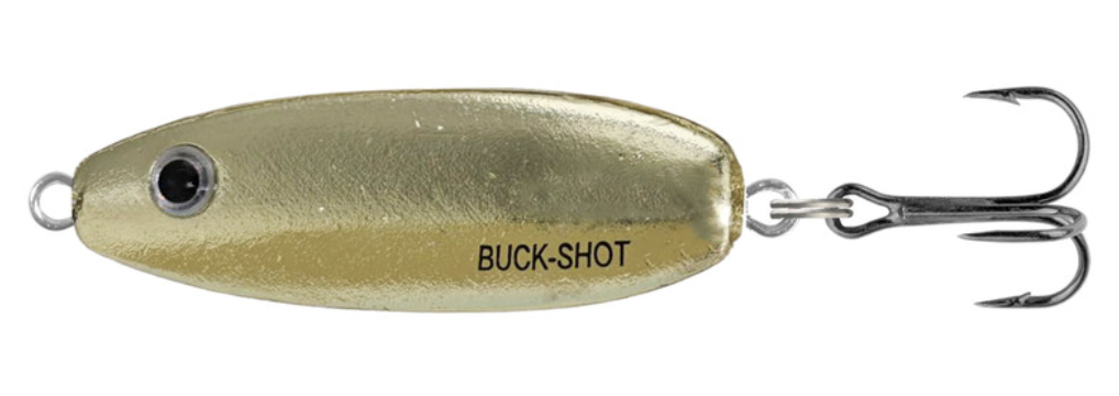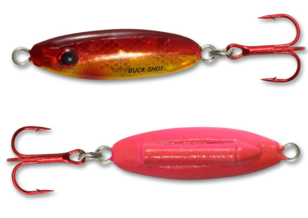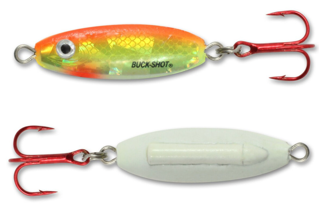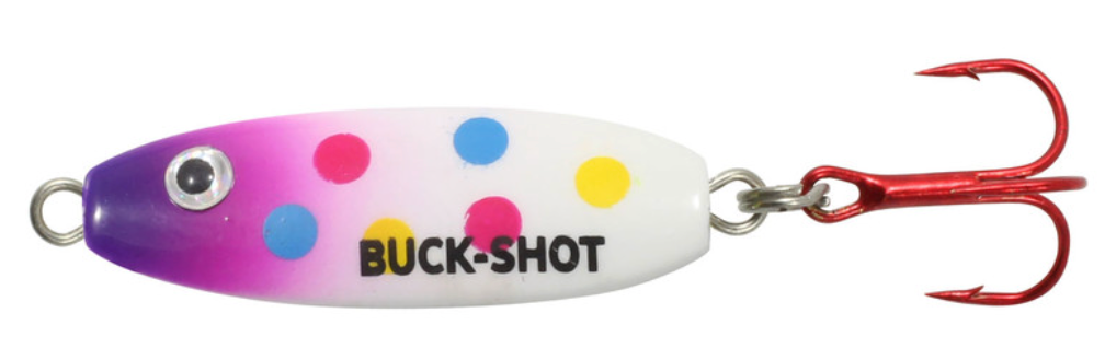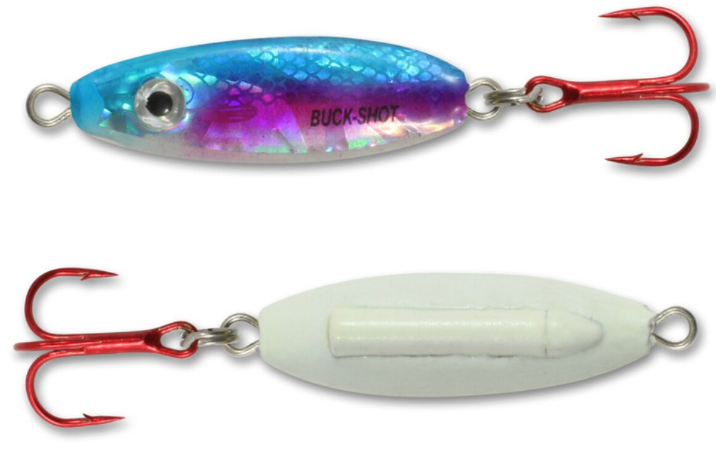 The Buck-Shot® Rattle Spoon is deadly in both hard and open water fishing for vertical jigging perch, walleye, trout, bass and pike. Jig aggressively in a lift-fall manner to call fish from a wide radius and make them strike. Tip with your favorite live baits like minnow heads and wax worms. The UV Buck-Shot® Spoon is finished with a highly-visible UV enhanced optically enhanced brightener visible to fish in the darkest of water. The ticking, thumping and clicking Buck-Shot® Rattle gets the attention of fish from a wide radius. The UV attraction combined with fish-attracting “feeding” sounds along with the Tiger Striped pattern results in a deadly mix that’s guaranteed to put fish on the ice.