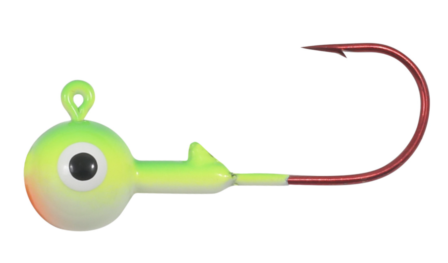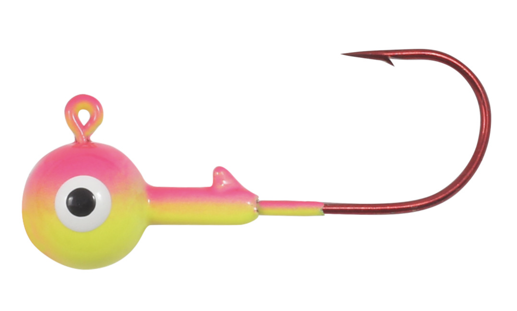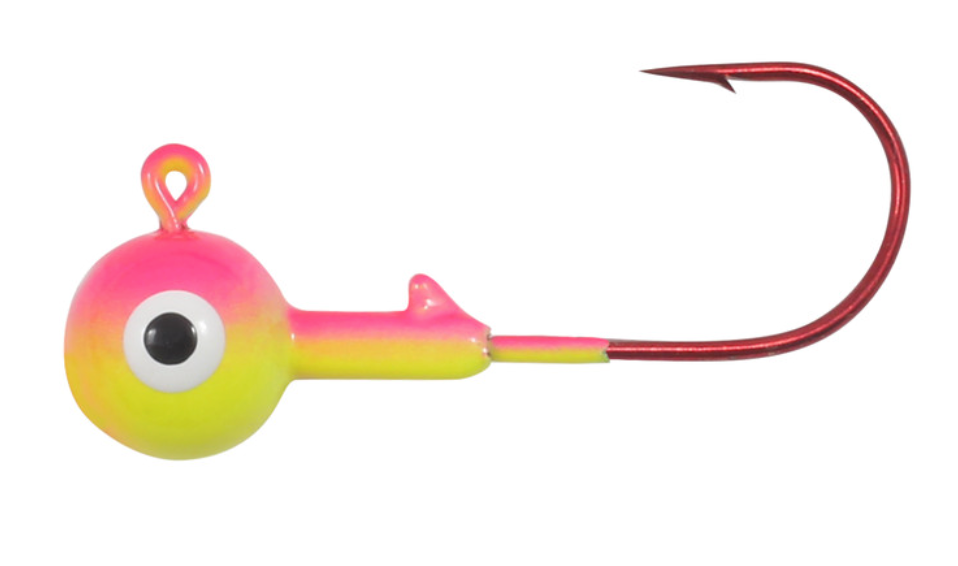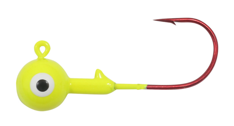 The classic round head jig. Featuring super-sharp hooks, molded bait keeper and appropriately sized eyelets. The Gum-Ball® Jig comes in 22 colours and 8 sizes, so you can have a Gum-Ball®Jig for every situation. Its lead jig collar provides balance to the jig and holds onto soft plastics and live bait. They feature blood red and black nickel hooks that are custom designed so the tie eye fits flush with the head. Sizes 3/16 - 1/2 use a +1 size larger hook making them perfect for larger predator fish like walleyes.