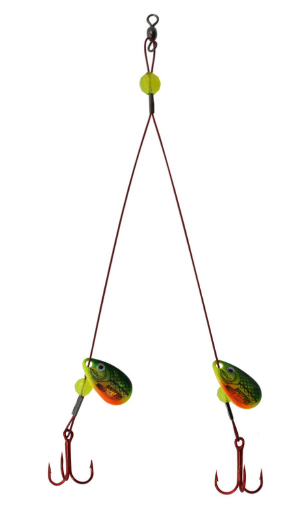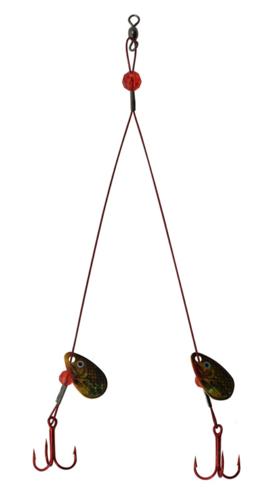 Fish below a tip-up or large float for trophy northern pike, walleyes, lake trout and muskies. Yoke-style design is ideal for live or dead bait. When rigging, position trebles so bait hangs horizontally. Set hook immediately when a fish takes the bait.