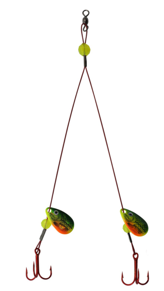 Fish below a tip-up or large float for trophy northern pike, walleyes, lake trout and muskies. Yoke-style design is ideal for live or dead bait. When rigging, position trebles so bait hangs horizontally. Set hook immediately when a fish takes the bait.