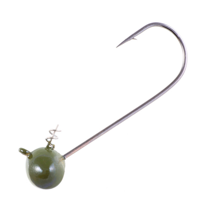 The Shaky Football Head features Owner's Twistlock® "Centering Pin Spring" molded into the lead. The football shaped head is contoured on the bottom to promote a rocking motion in the plane of the hook to achieve "up-and-down" movement. Features include a round bend, light wire hook with a 45° cross-eye, Super Needle Point and black chrome finish. Heads available Green Pumpkin colour.