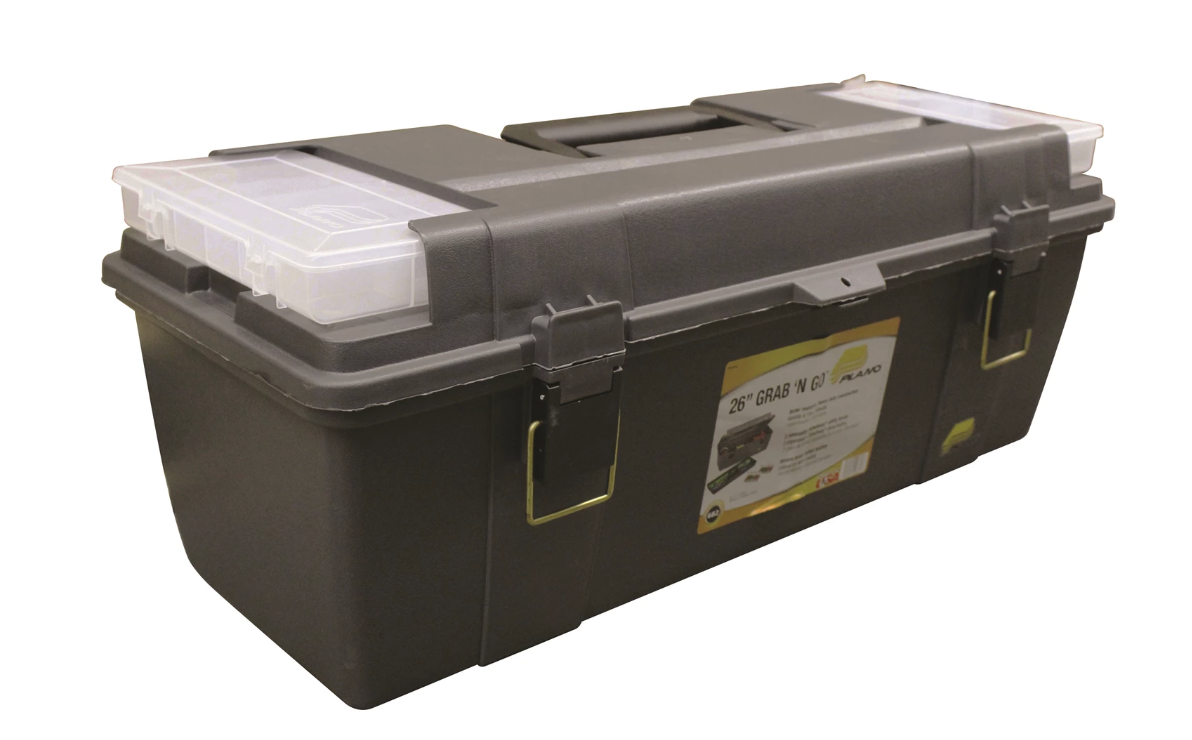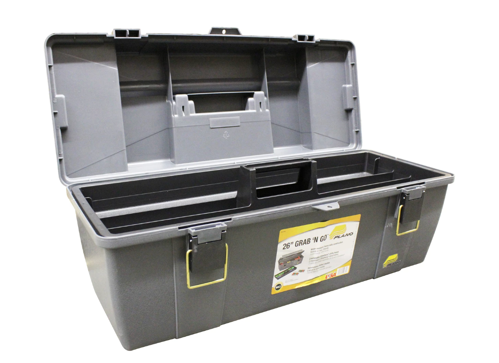 Large open storage, partitioned lift-out trays, heavy-duty reinforced latches and removable small parts storage make this a tool box for every job! Full-sized lift-out tray. Comfortable handle. Sturdy brass-bailed latches. Includes: (qty. 2) removable StowAway utility boxes built into the lid.