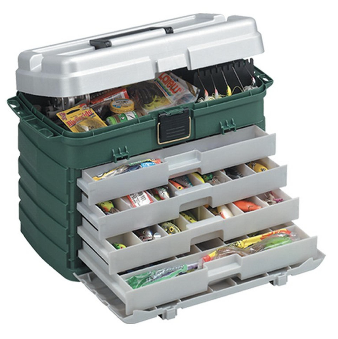Be ready for whatever the day brings with our Four-Drawer Tackle Box. With four spacious drawers behind the DuraView™ front door, four removable bait racks, instant top access to your most used baits and convenient side tool storage, you'll be fully prepared for a great day on the water.Spacious bulk storage under lid