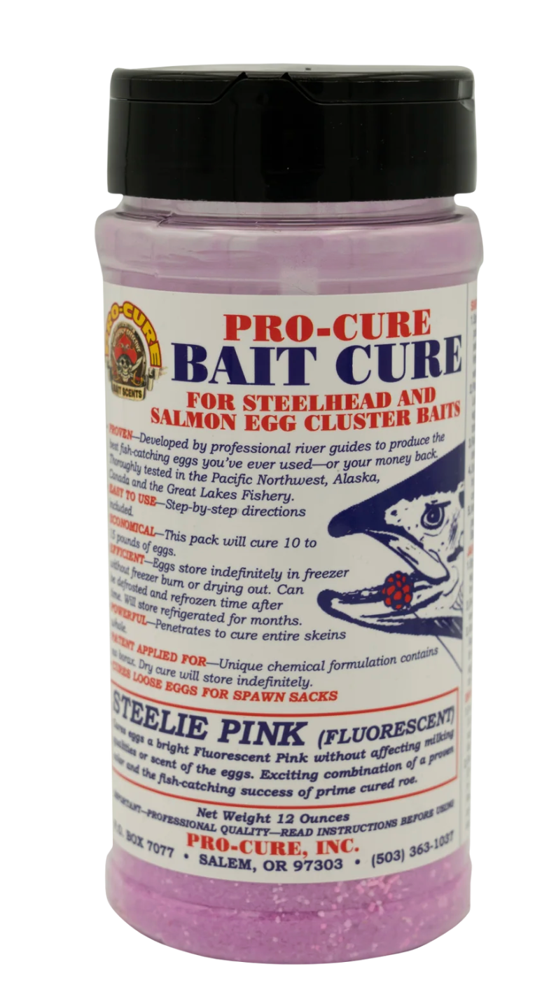 Produces a medium bright pinkish red egg that is a favourite with steelhead and trout anglers. On some rivers it's the hot colour for salmon. With all of the new great cures there are still a tremendous amount of anglers who refuse to give up on some thing that works so well. On the market for over 20 years the original PRO-CURE formulas still kick serious butt. So if it ain't broke don't fix it.