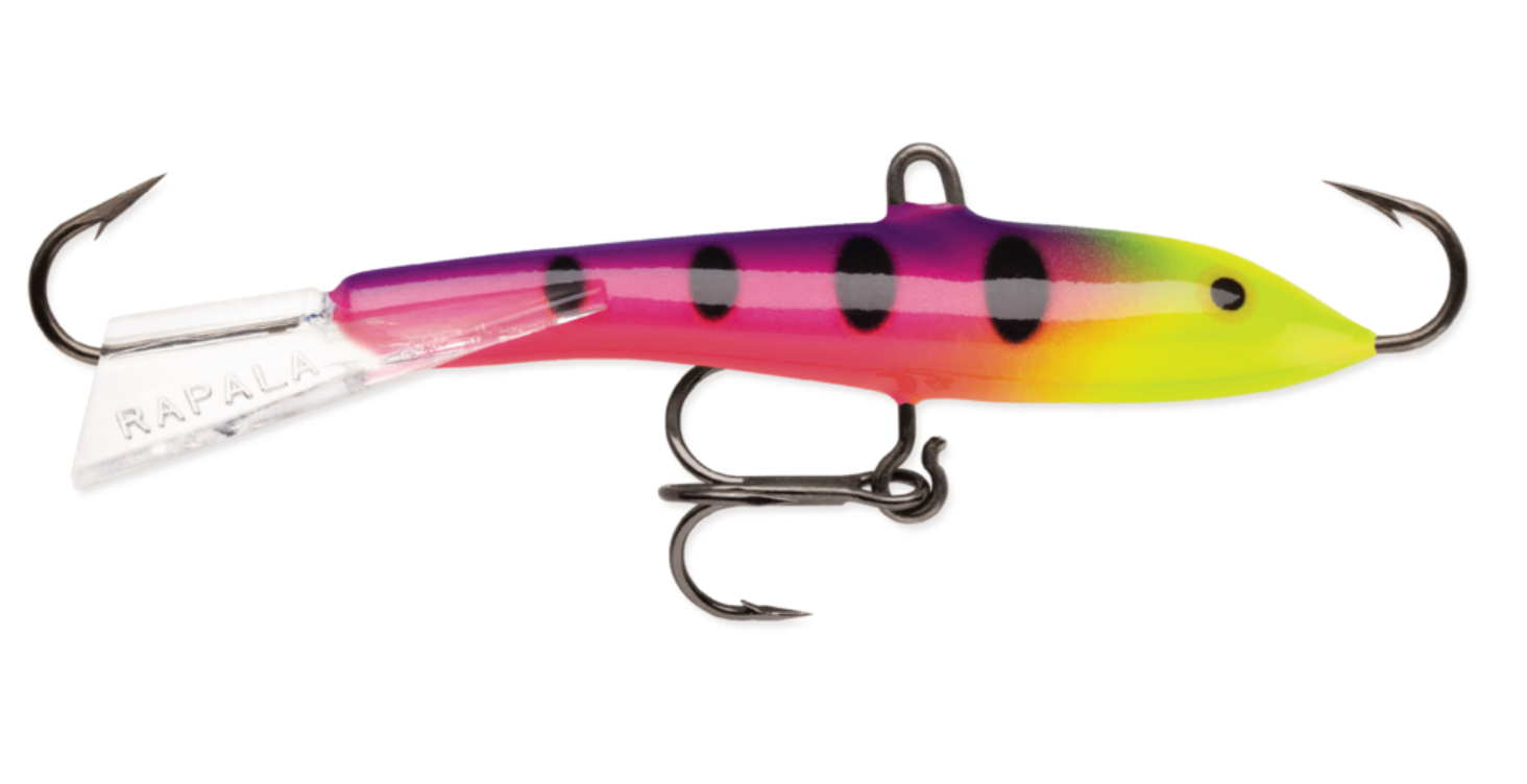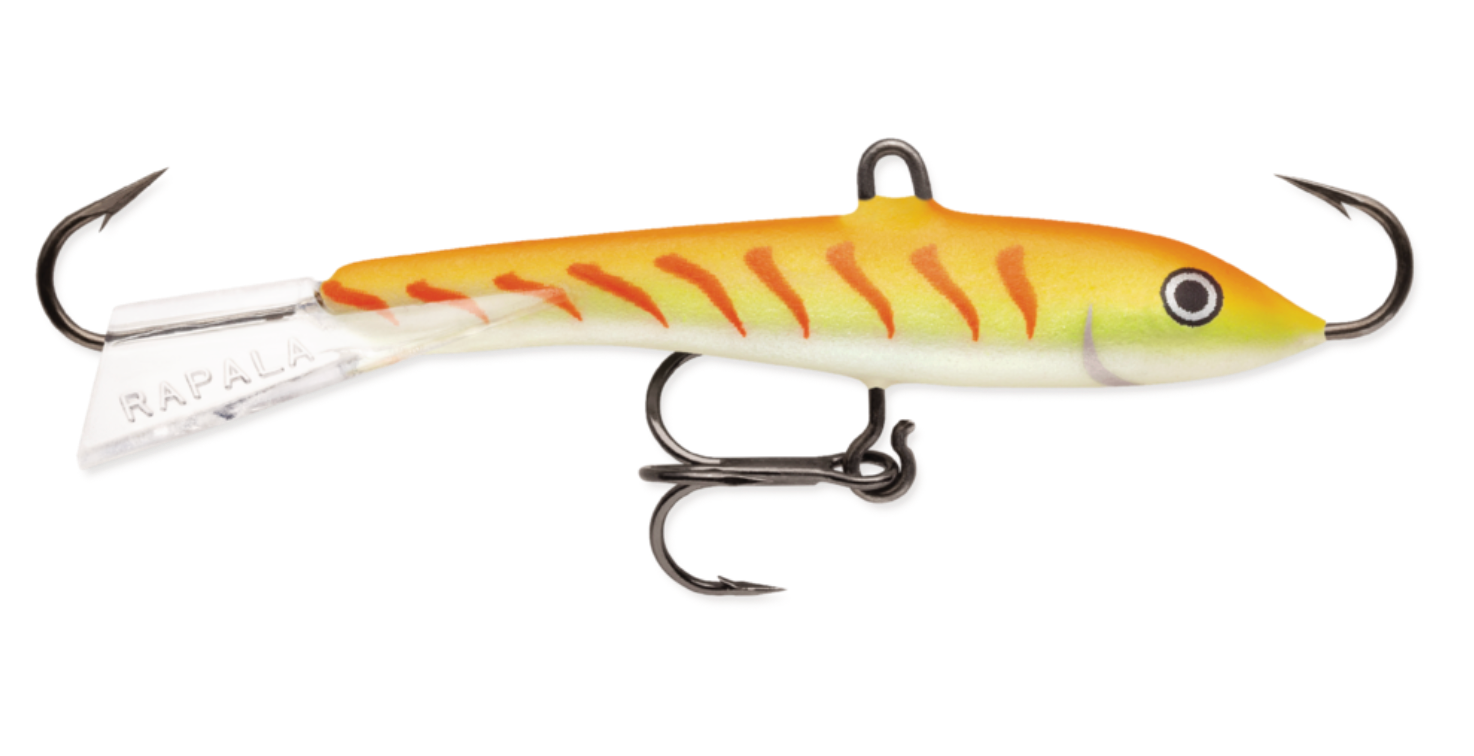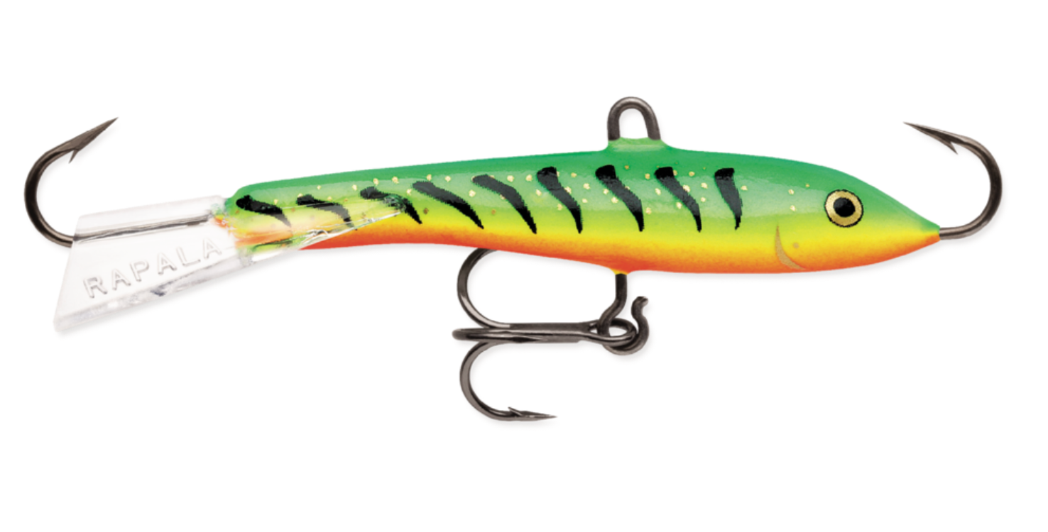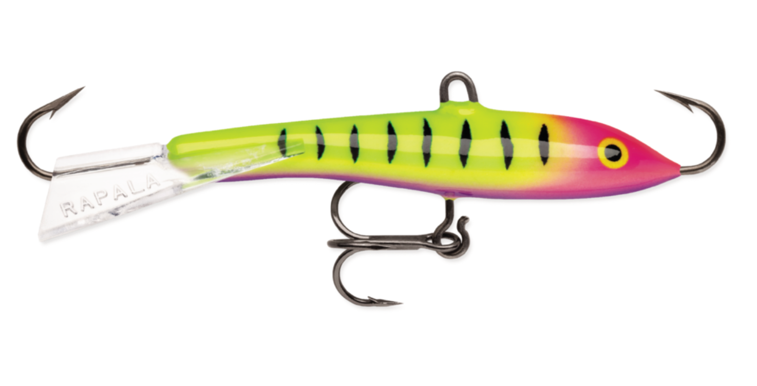 Swimming in tantalizing circles under the ice or in open water for suspended game fish, the Jigging Rap® features a balanced, weighted minnow profile. Single reversed hooks with center treble and eyelet, this bait can also be bottom bounced, yo-yo style off the bottom with unbeatable results. Wide range of sizes is complimented with natural and glow color patterns.