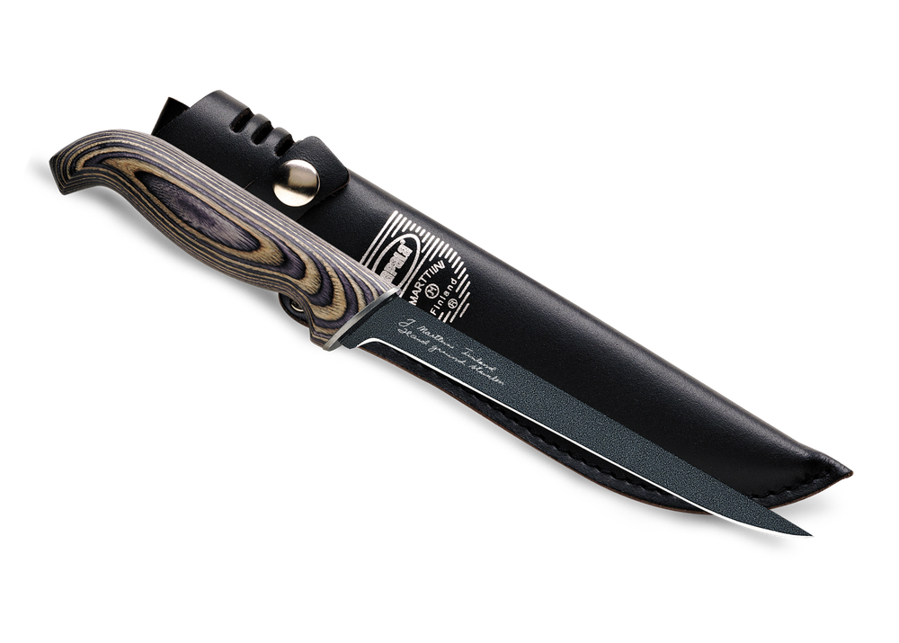 Made by Marttiini, the makers of premium Rapala fillet knives for over 50 years.Updated Nordic design creates a modern classic. Brown laminated handle features a polished stainless steel blade while grey laminated handle model has a PTFE coated blade. Both feature progressive tapered blade for concentrated cutting power tip to tang. Through tang construction adds noticeable leverage. Both are completed with coordinated, genuine leather, tooled sheath with belt loop and snap closure. Made by Marttiini.