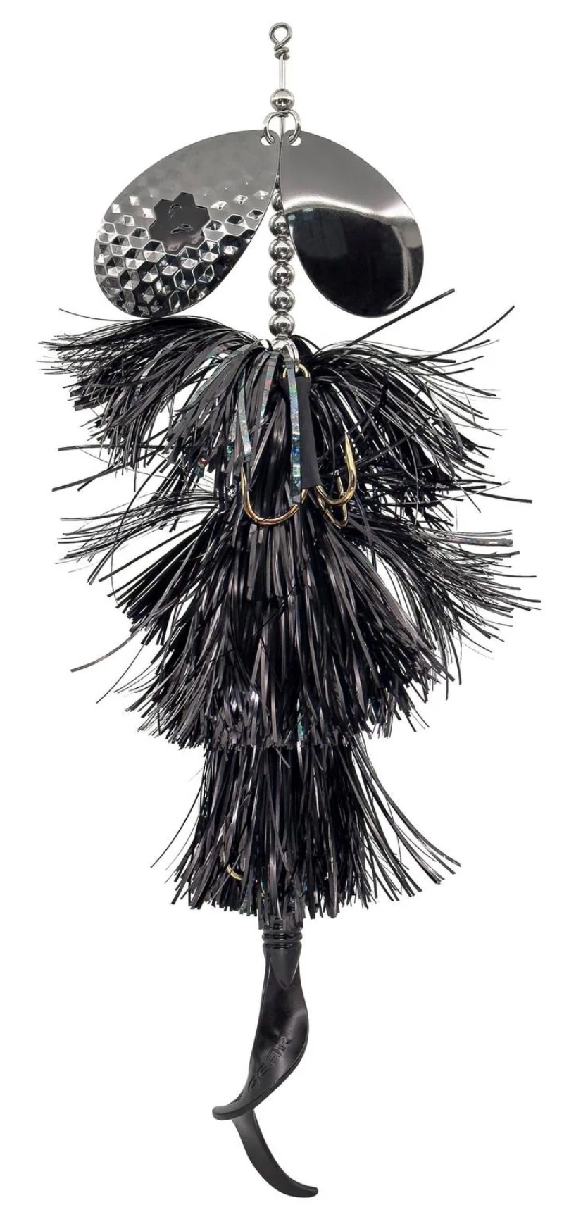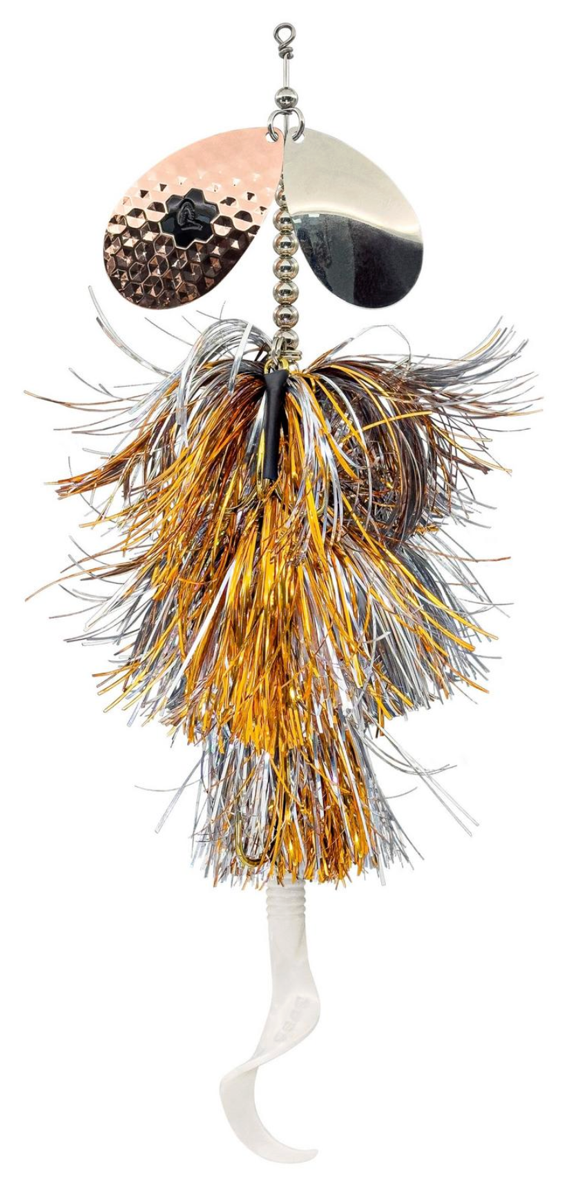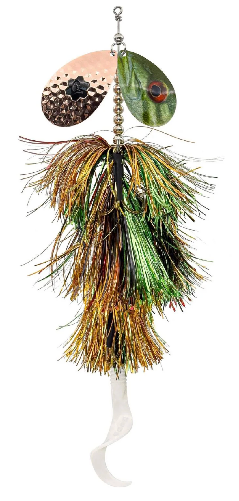 Unleash the Savage Blade! Our custom designed bucktail is built with high grade custom components and crafted to perfection! The custom blades fold in flight and rotate immediately on retrieve so you don’t waste an inch of your cast. Their custom design sends out big pulses and vibration to draw in huge fish. The clever configuration, with the detachable weight allows you fish over the weed tops or deeper over structure and rock piles. Our hand-tied Skirts, have the perfect volume, to create a big pulsing silhouette and still collapse perfect on the strike. The custom carbon steel 3X tail Treble hook, has a Stainless steel corkscrew with a pre-mounted scented Trailer tickler grub tail, raising many fish to follow and strike.