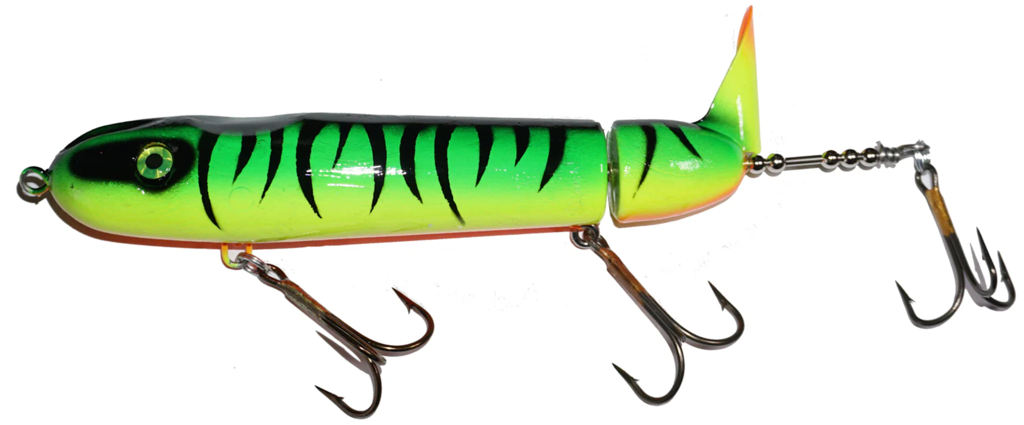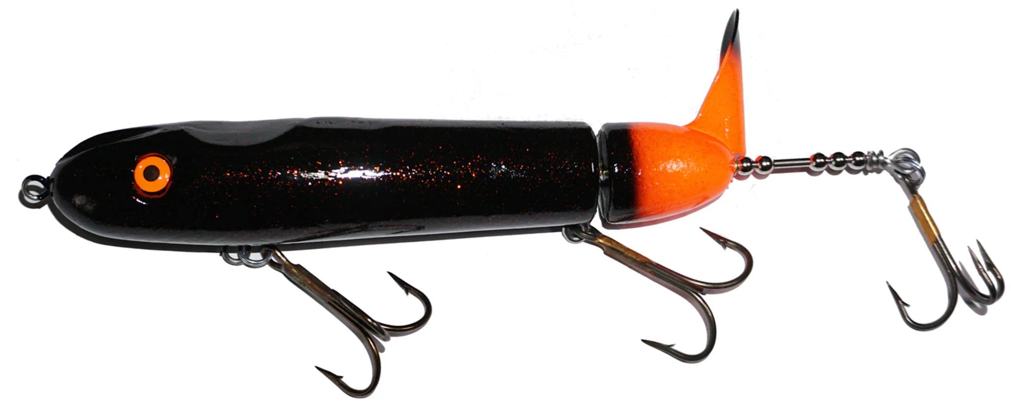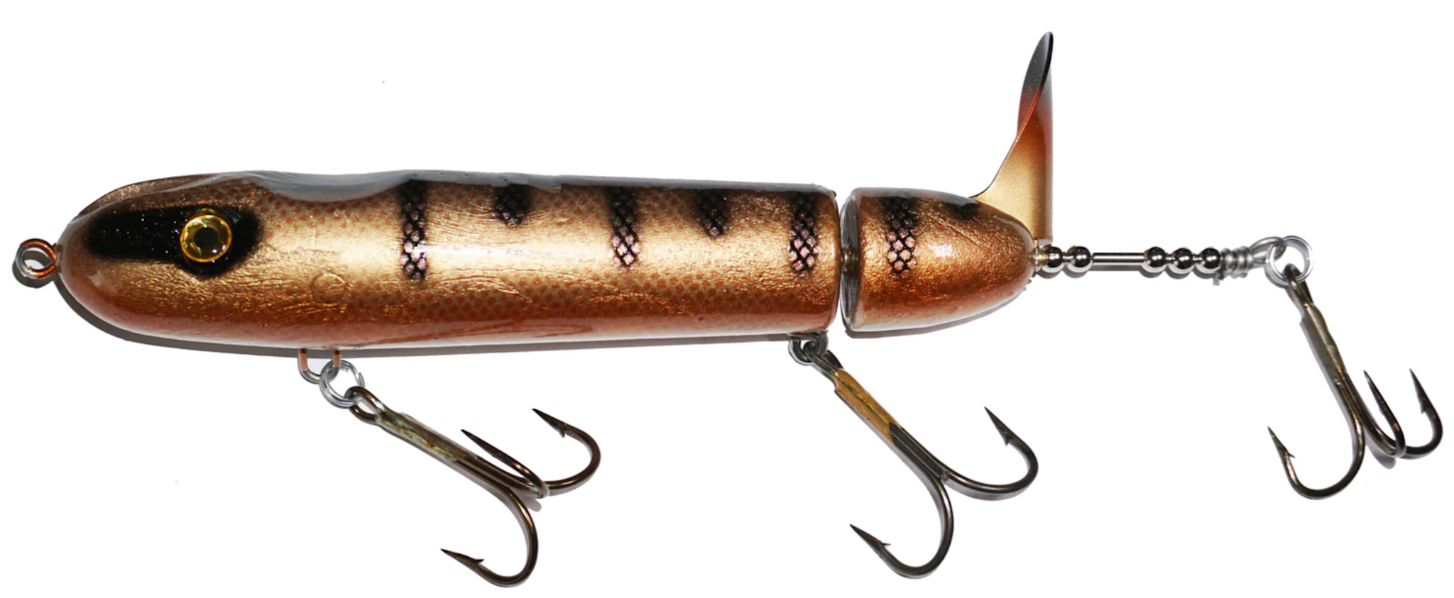 Designed by Chippewa Flowage musky guide Ty Sennett, the Pacemaker can stand up to the most ferocious strikes. All Pacemakers are made with the highest quality components including: a solid, durable plastic body, through-wire construction, an extra strong brass blade, and heavy duty hooks. The key to the Pacemaker’s unique sound is the positioning of the middle hook to constantly click against the brass tail with each rotation. For best results reel at a steady, medium speed.